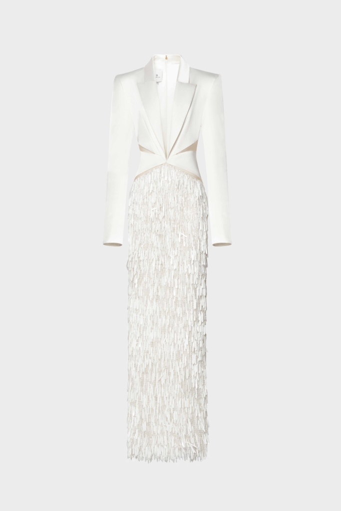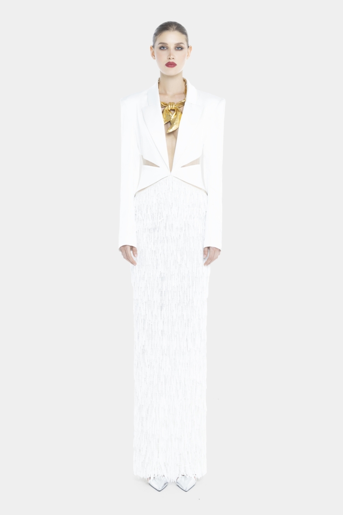 Crafted in sumptuous satin, the classic white blazer demonstrated the fashion house’s signature embellishment technique. Cut-out details at the waist and the deep plunging V neckline especially accentuate the actress’s alluring figure.