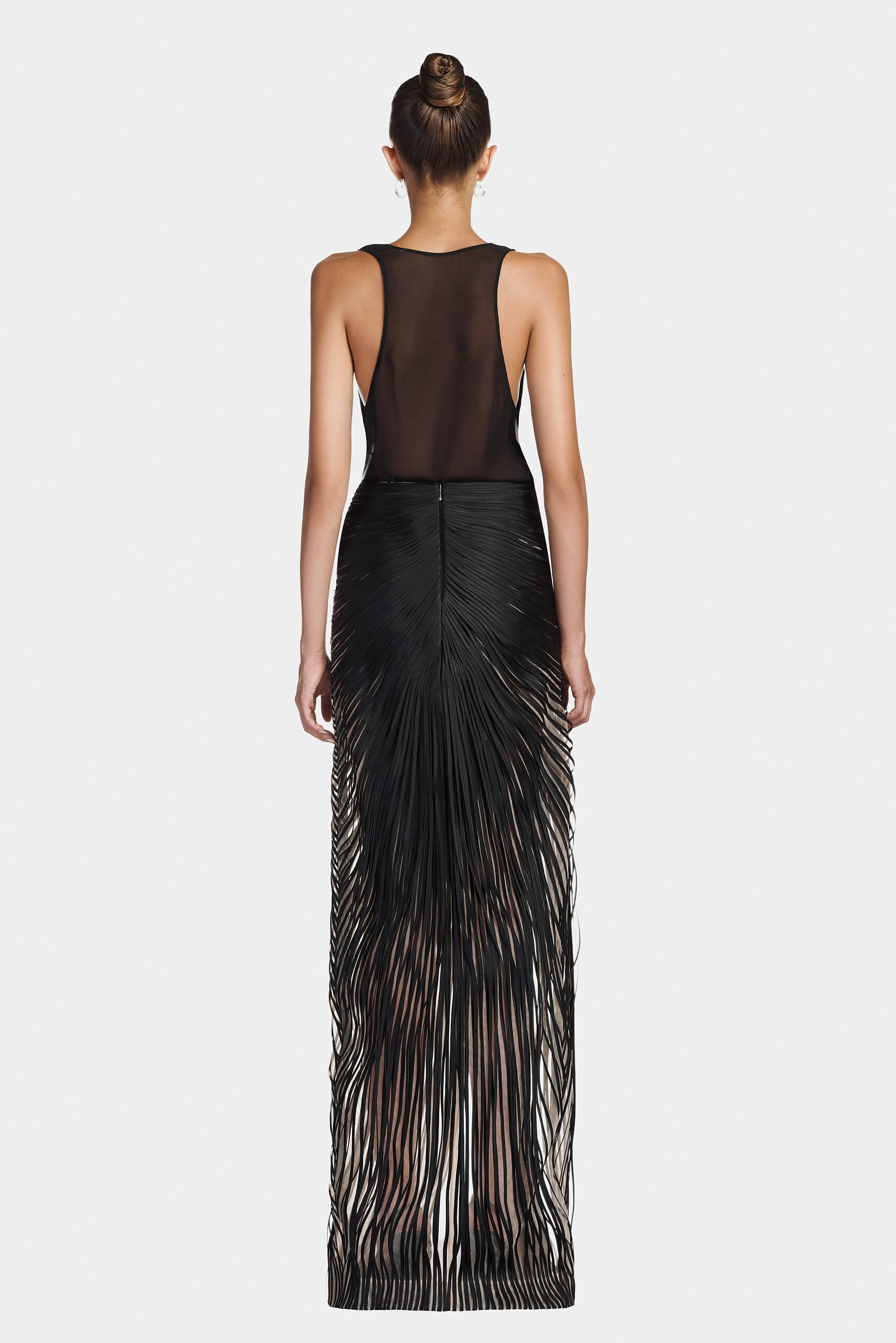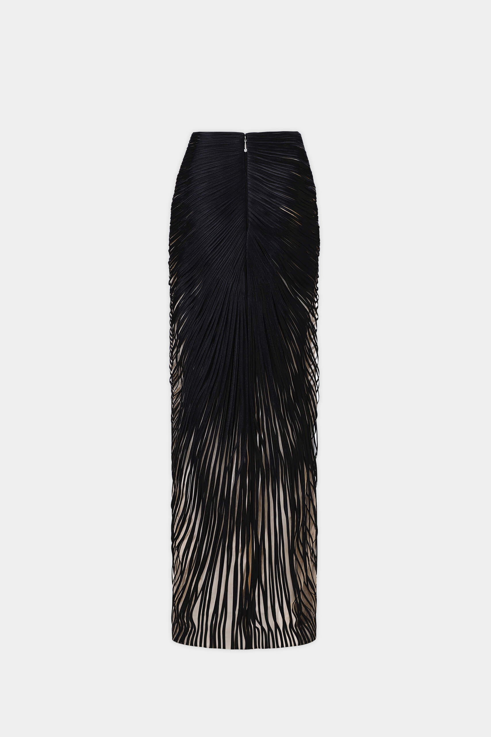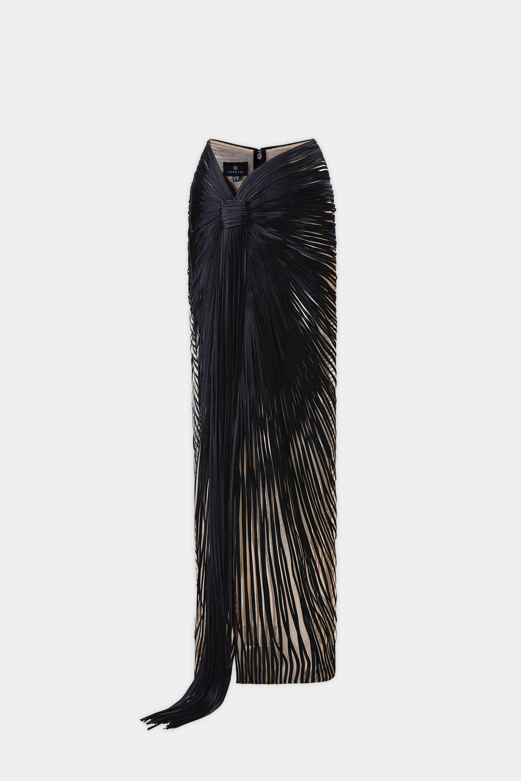 The skirt features a striped applique that shapes an asymmetrical silhouette. Fringe detailing falls from the hemline, introducing fluid movement and elongation. The harmony between structured precision and a flowing finish defines the design’s modern elegance.