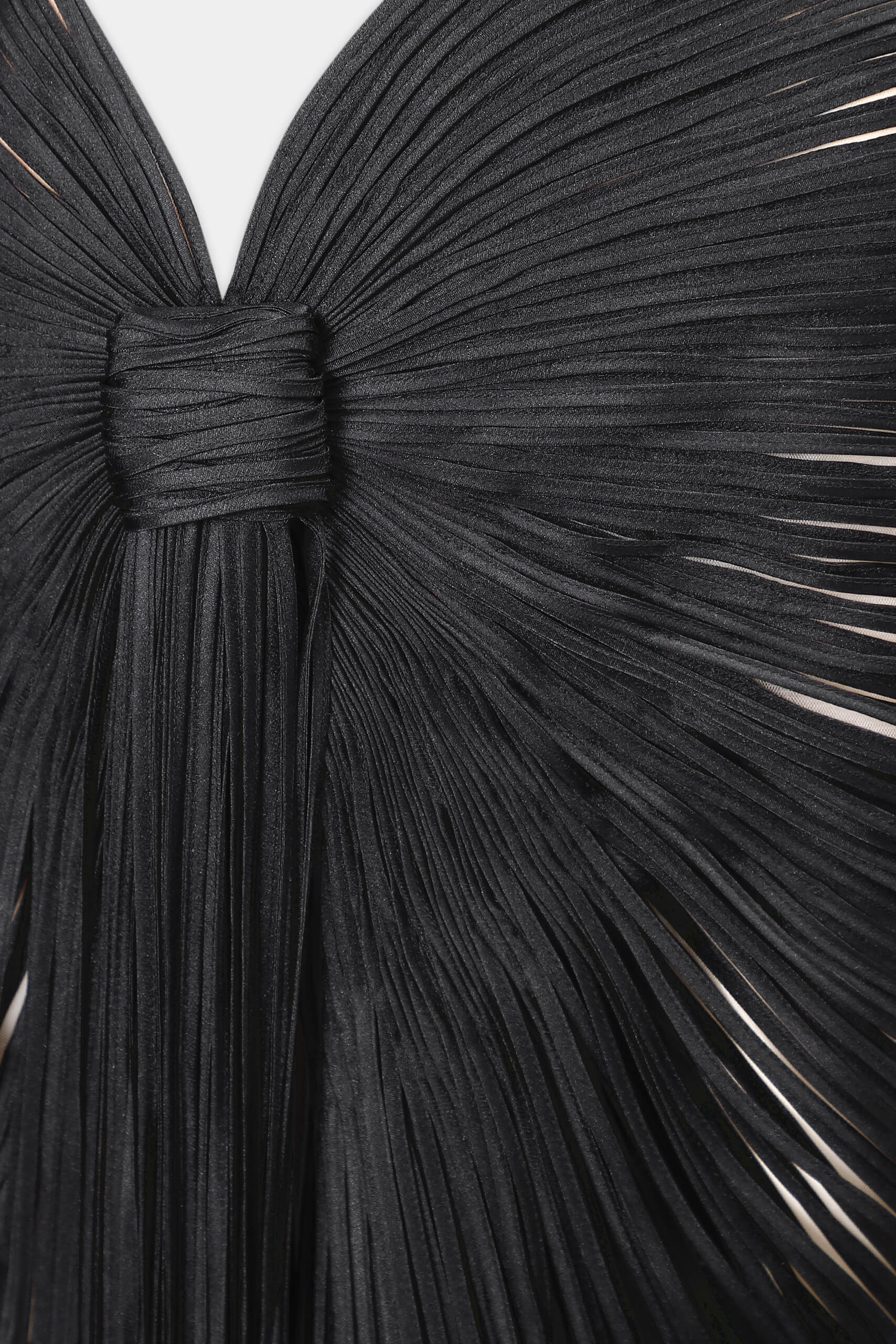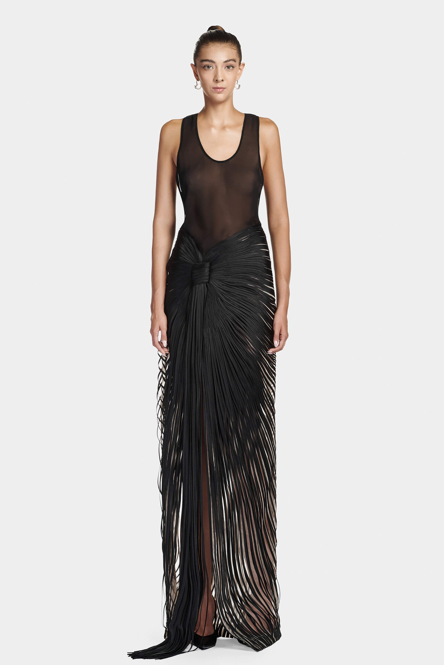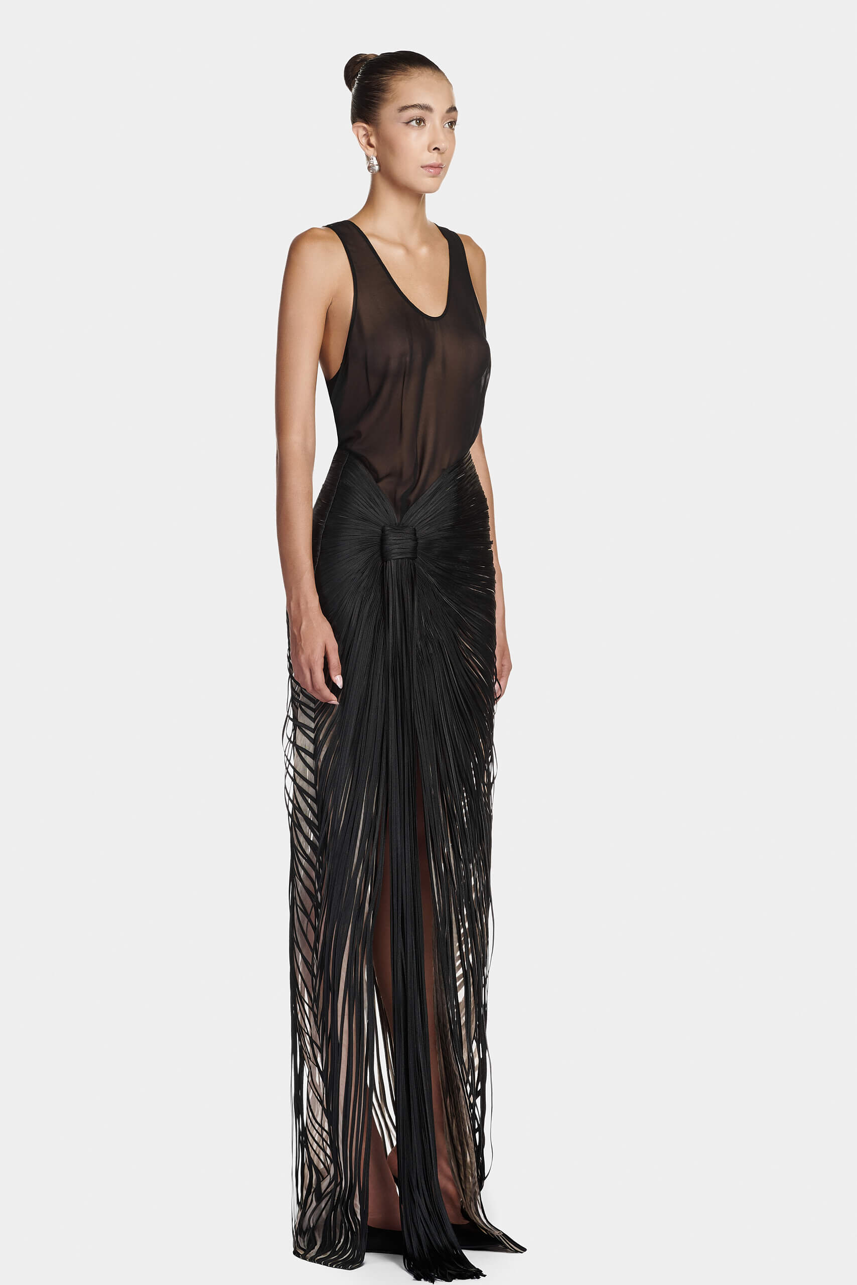 The skirt features a striped applique that shapes an asymmetrical silhouette. Fringe detailing falls from the hemline, introducing fluid movement and elongation. The harmony between structured precision and a flowing finish defines the design’s modern elegance.
