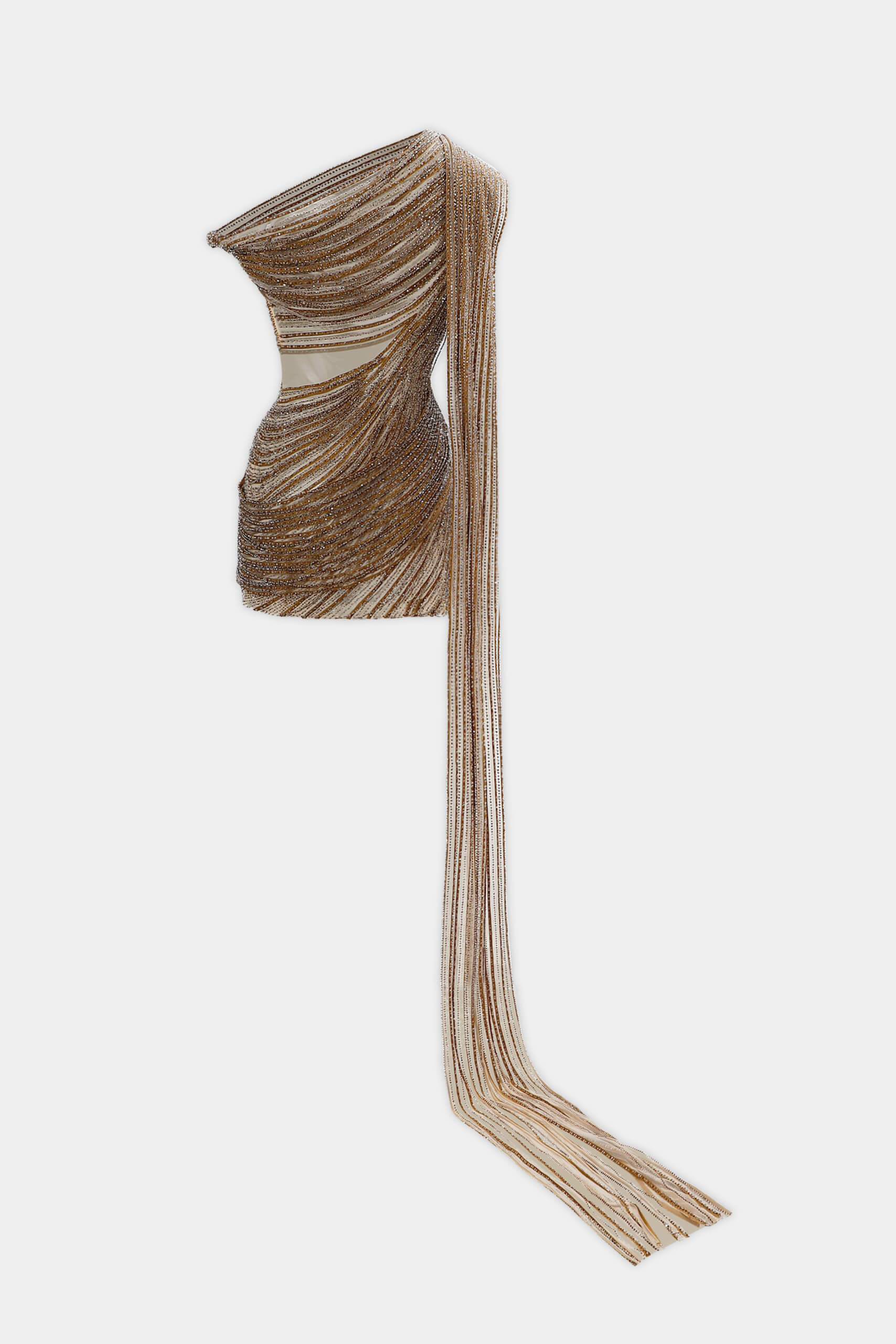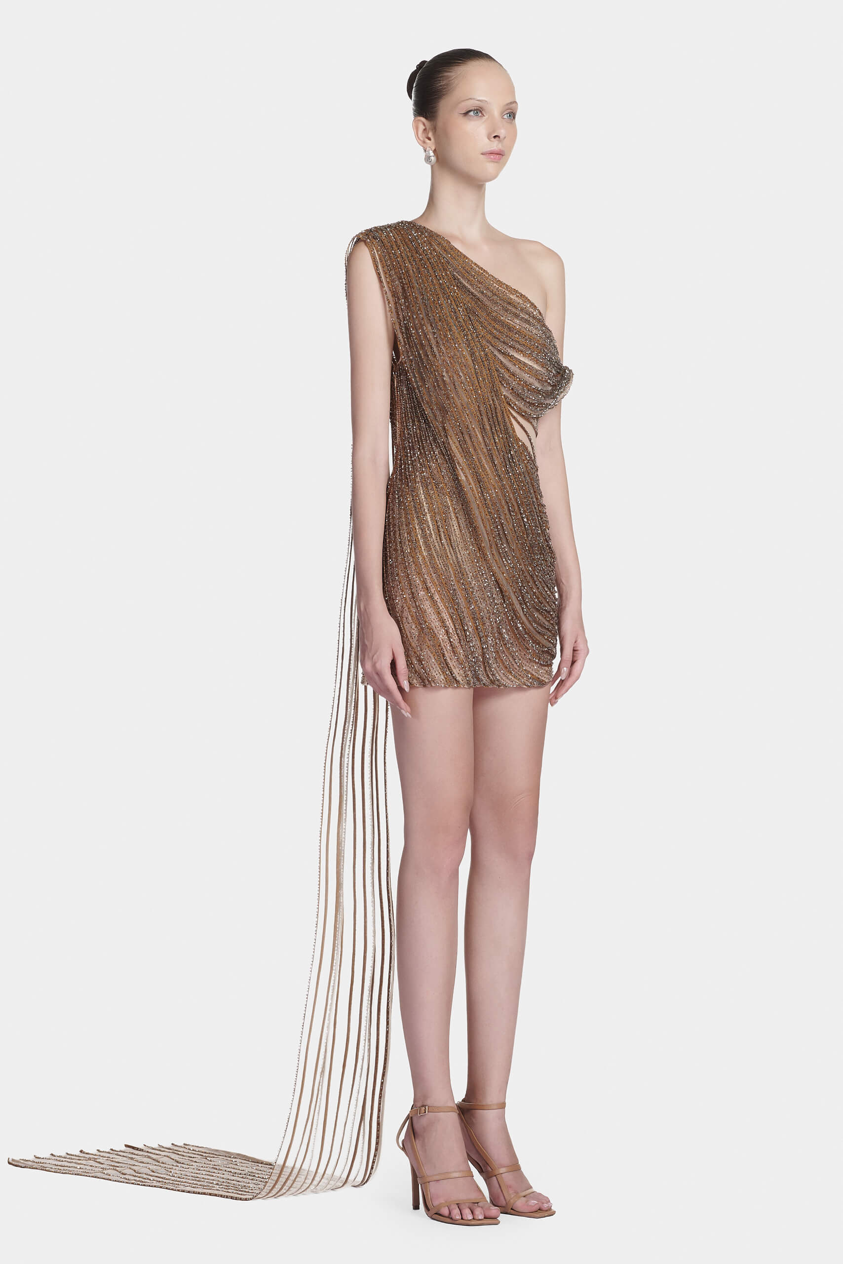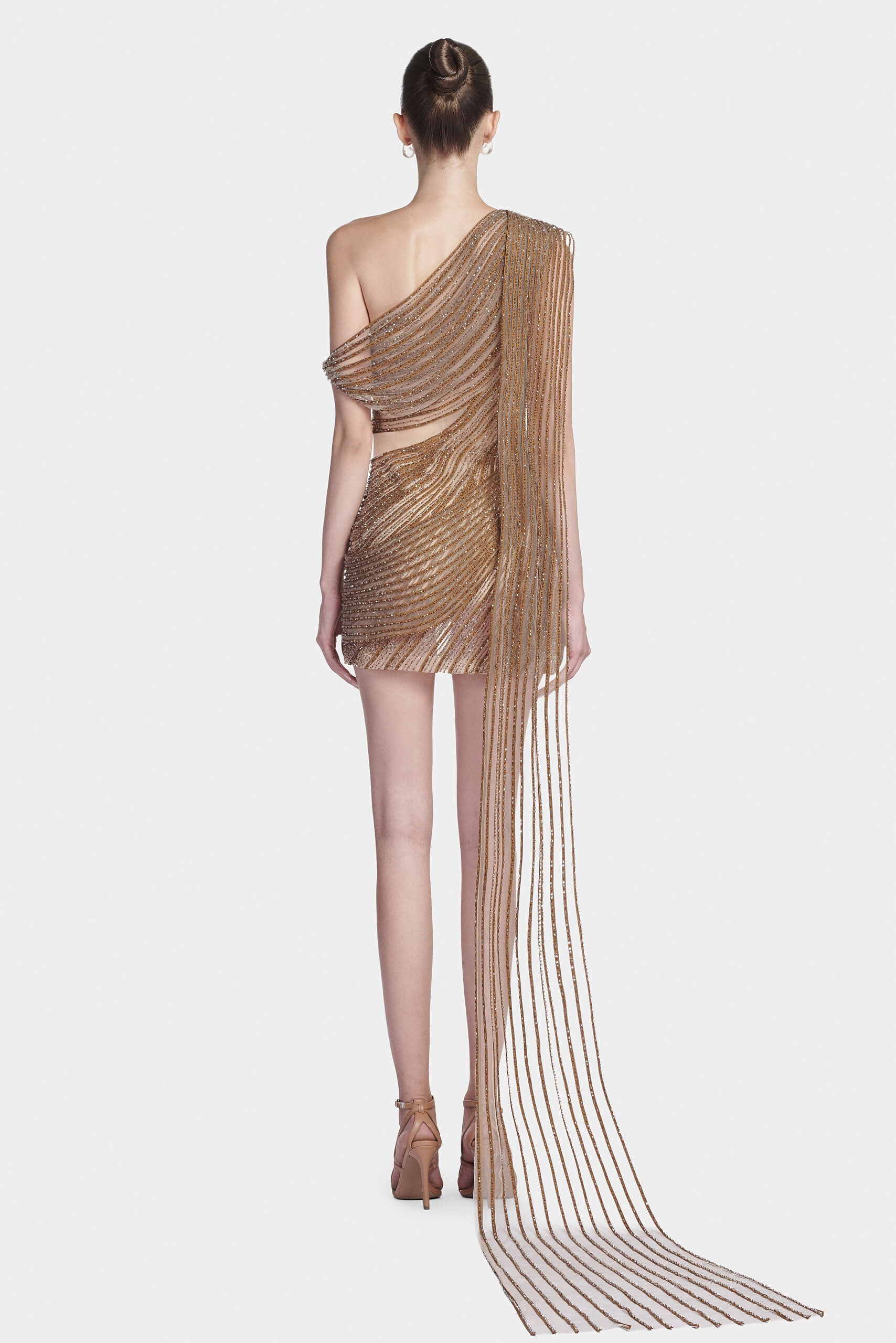 The mini dress exudes contemporary sensuality through intricate craftsmanship. Crafted from sheer mesh, it features organza striped appliqué that flows across the surface, delicately embellished to create a luminous shimmer.