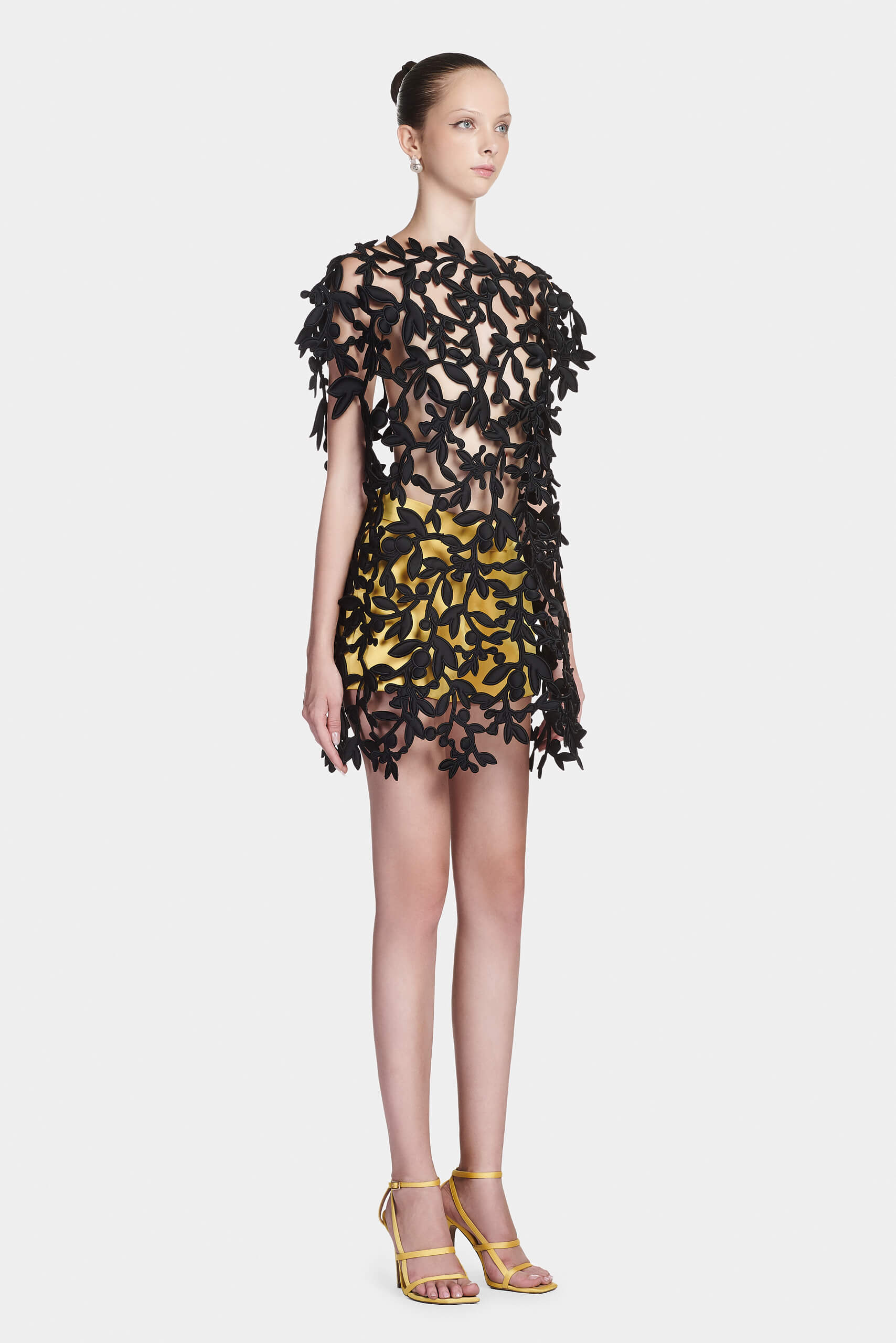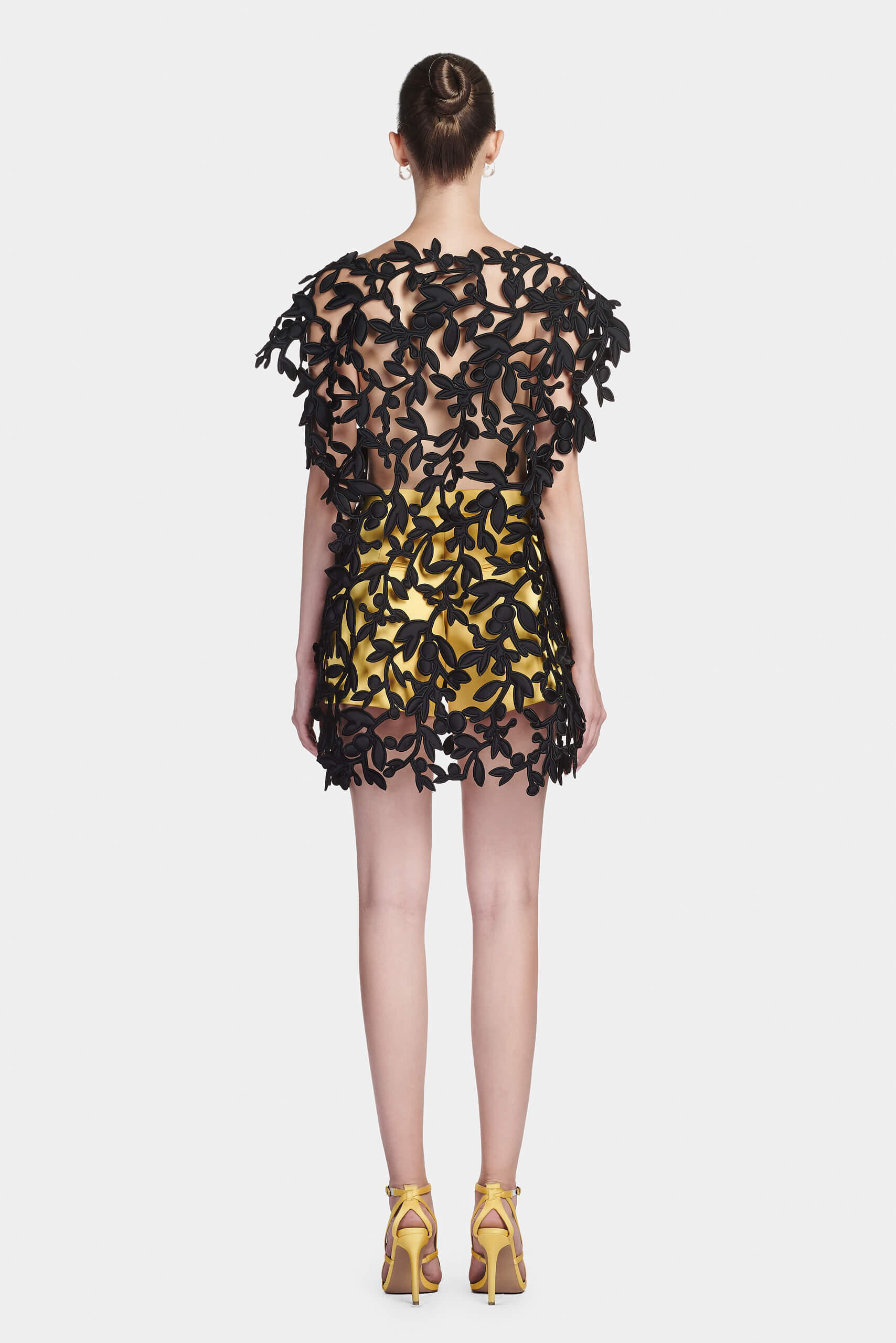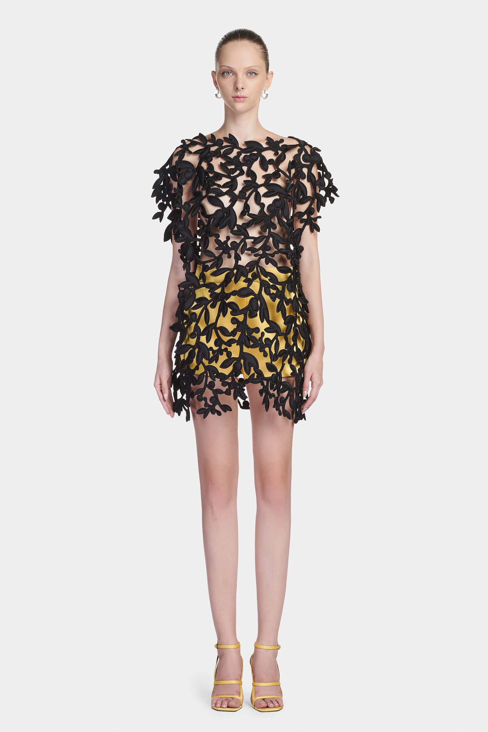The top is crafted from fine silk and adorned with raised embroidery inspired by the Diospyros mollis fruit — a symbol deeply connected to traditional Lanh My A dyeing craft. The textured embellishment adds depth and refinement to the fluid surface, balancing artisanal detail with modern sophistication.