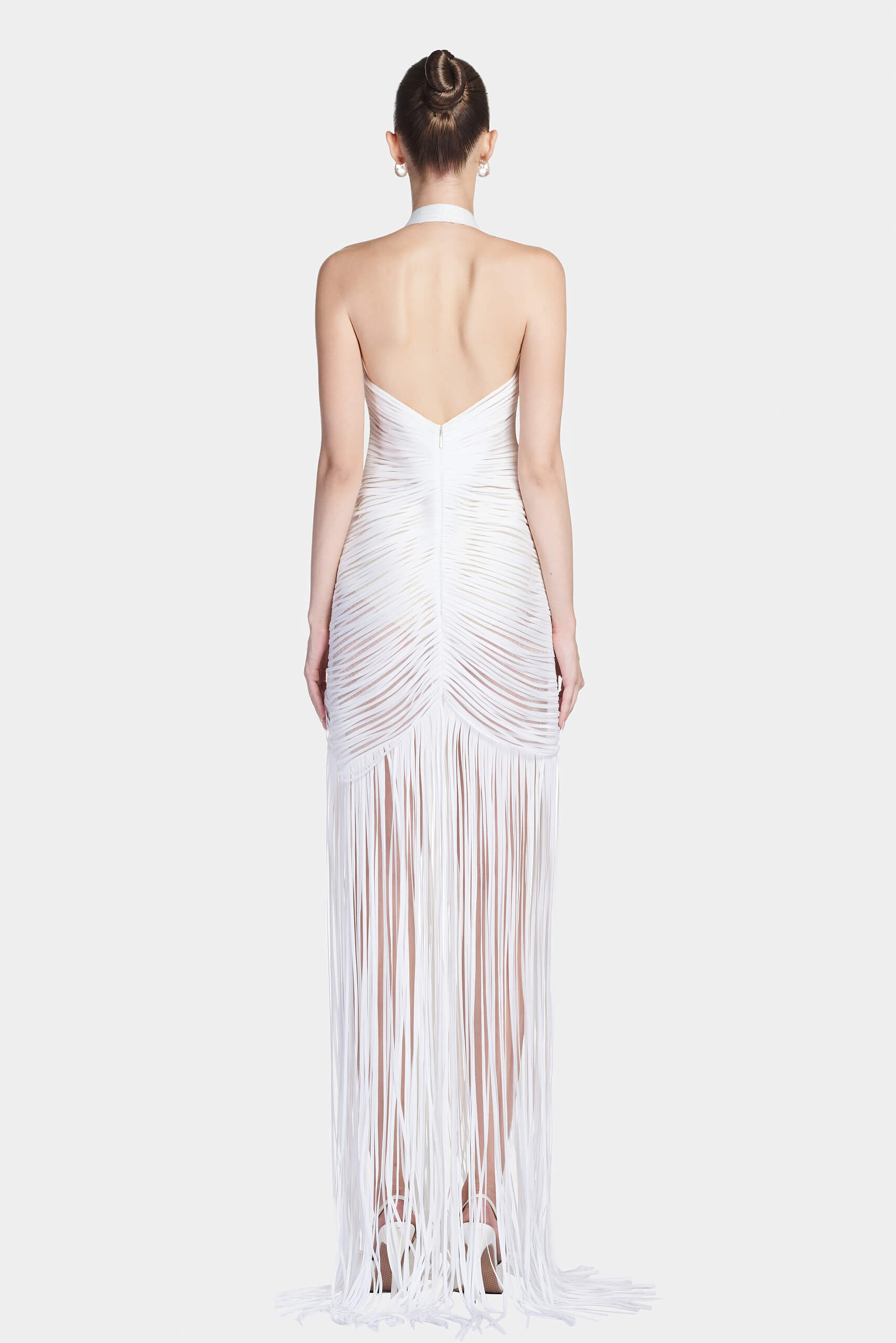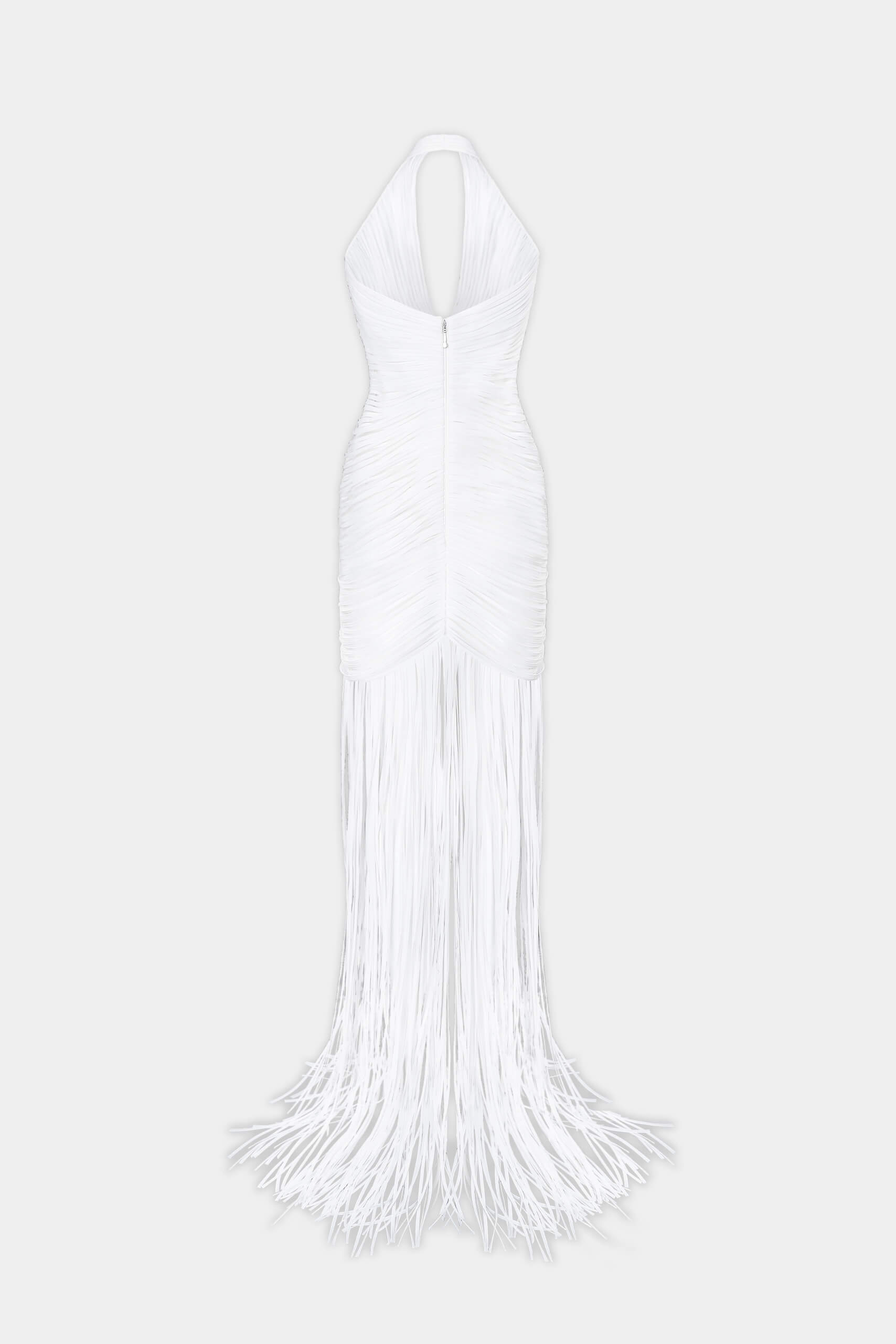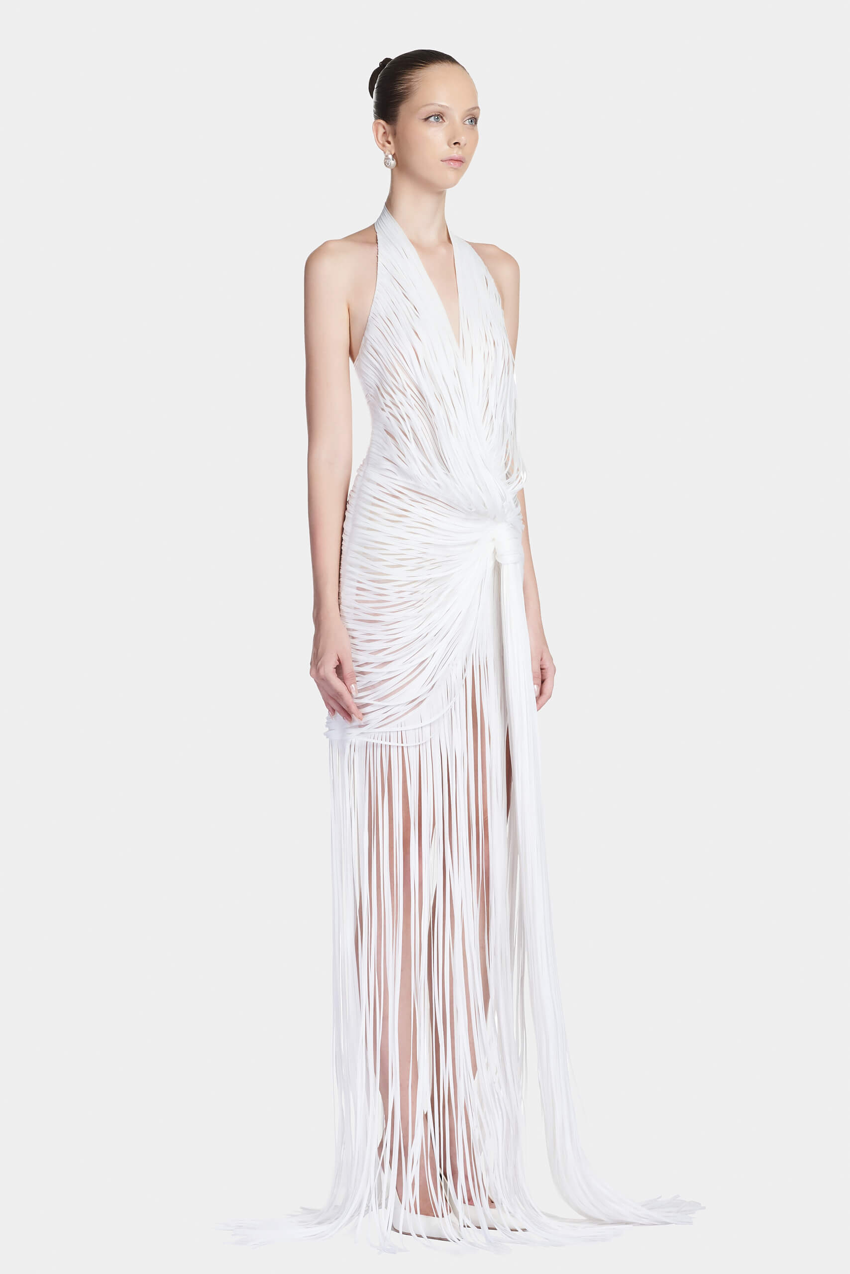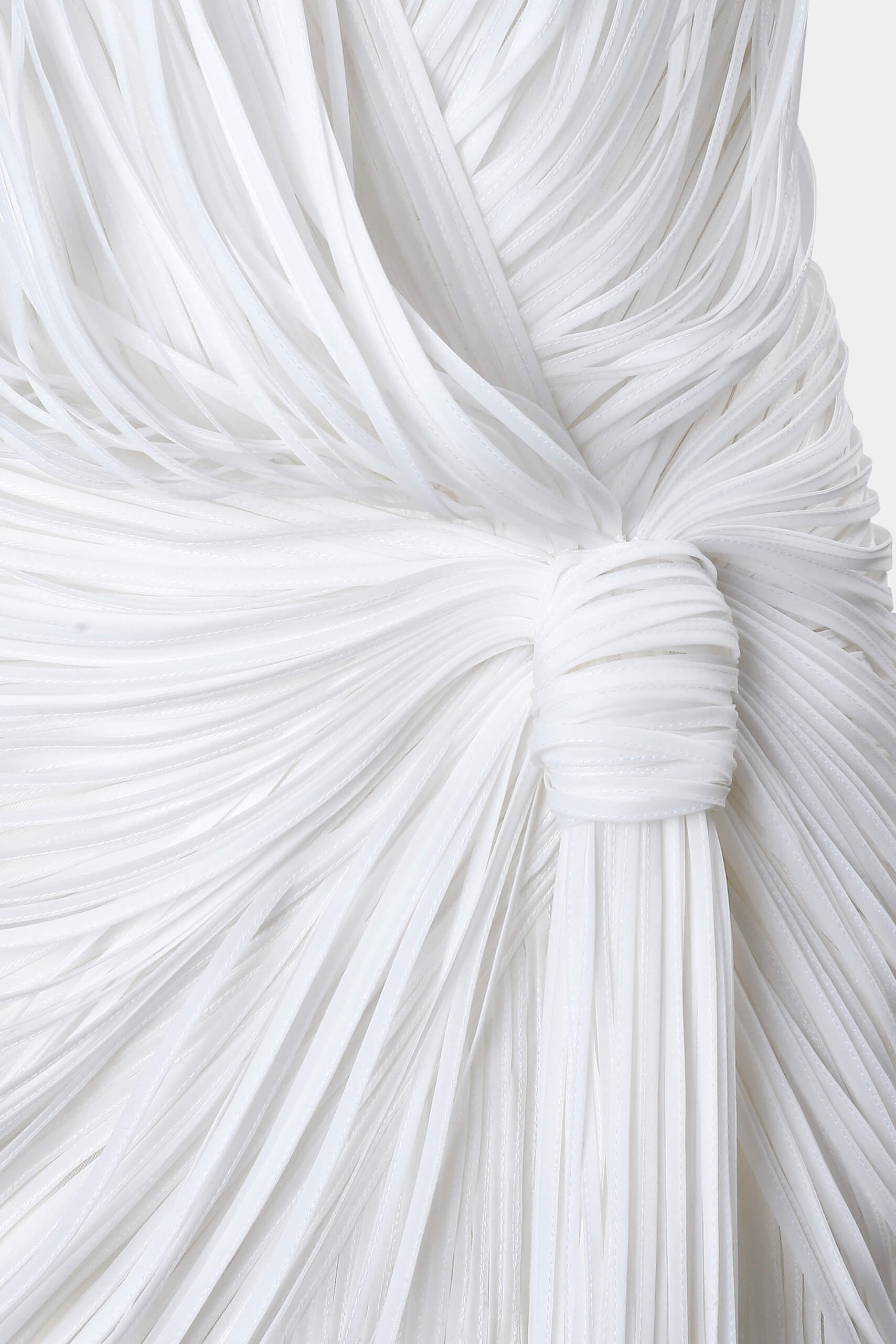 The dress captures lightness with a subtle architectural touch. Crafted in mesh, it features organza striped applique that creates linear patterns across the surface.