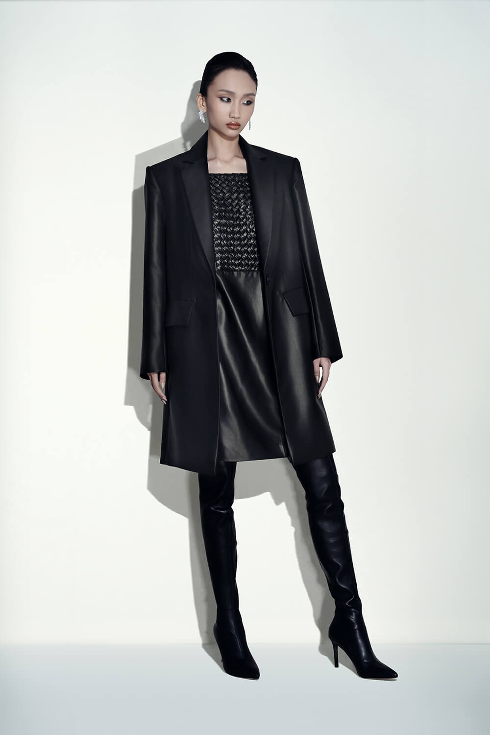 The coat speaks to the House’s vision of elegance and sophistication. Crafted in lacquer silk, the design offers an oversized silhouette and refined tailoring. It can be paired with the weave-detailed lacquer silk mini dress to complete the modern look.