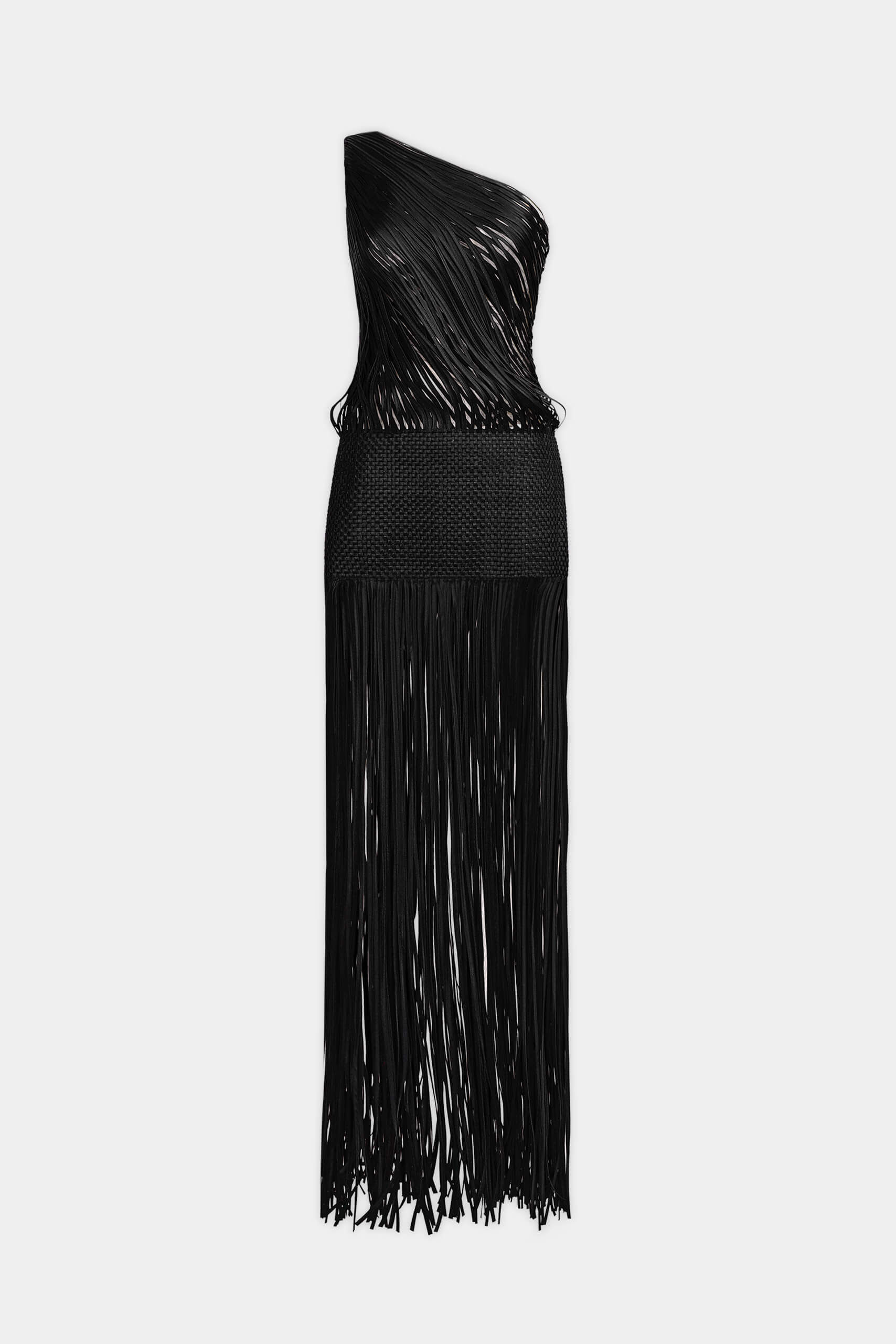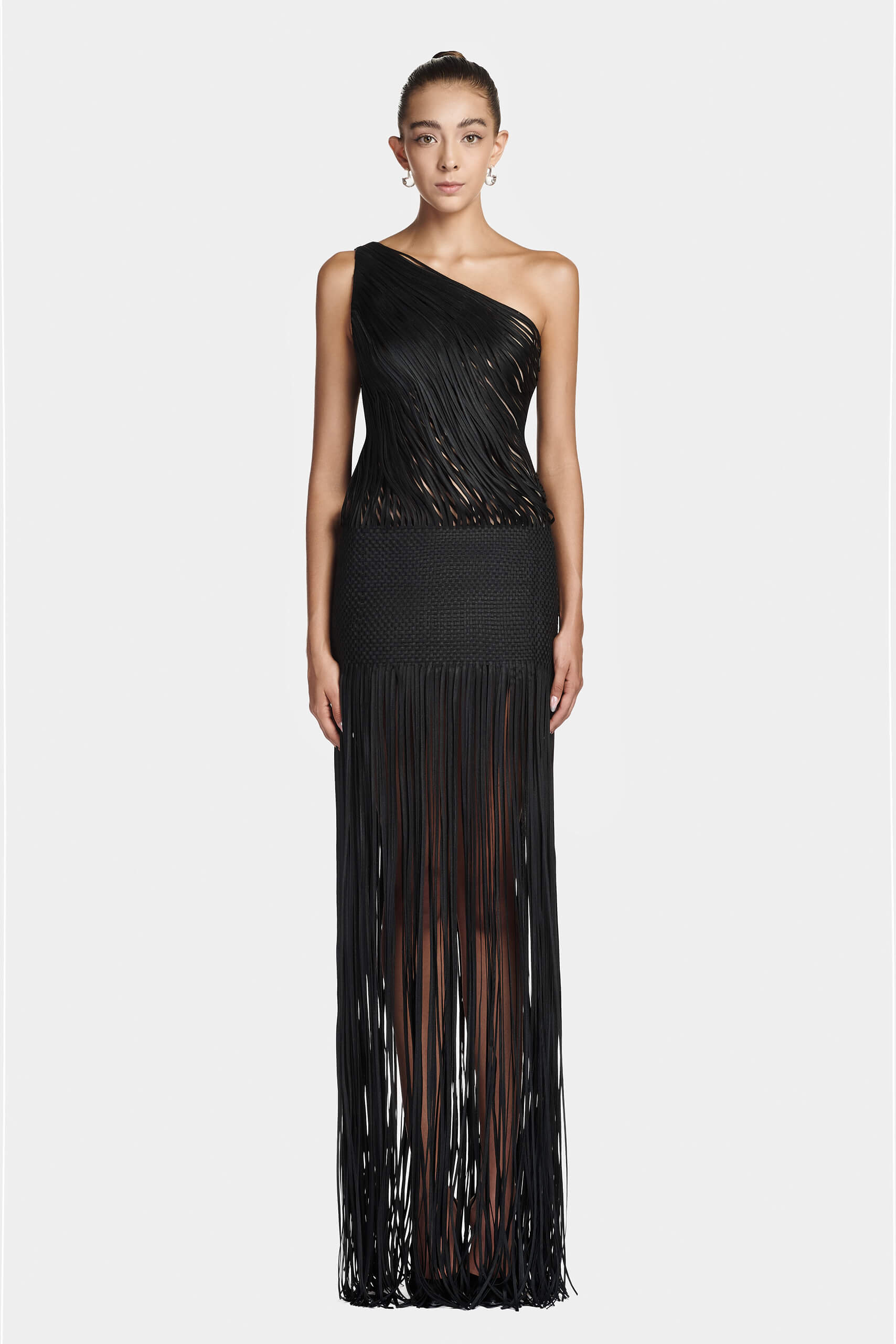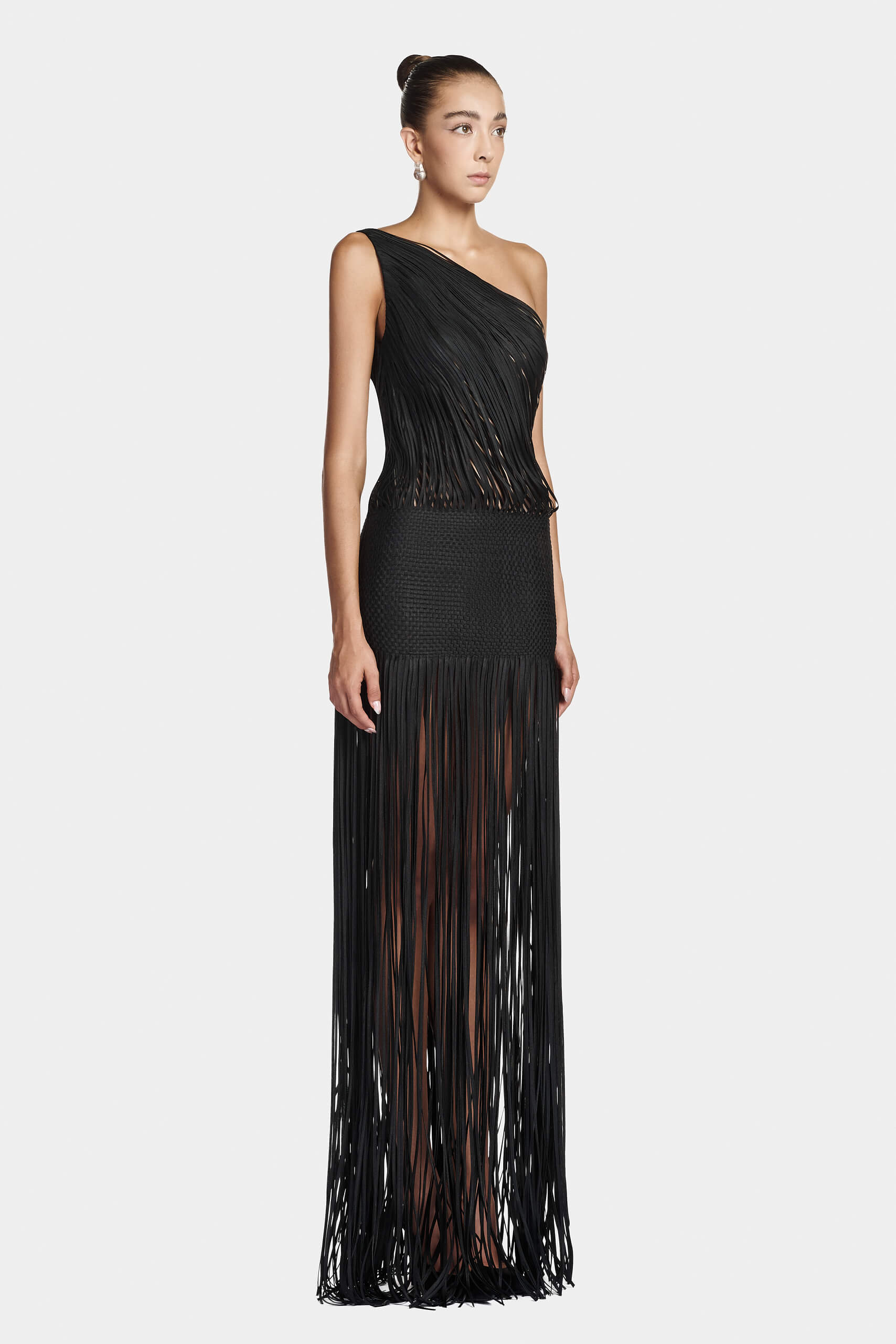 The dress channels a sense of modern romanticism with architectural allure. Crafted in organza, the one-shoulder silhouette is accentuated by striped applique detailing across sheer mesh.