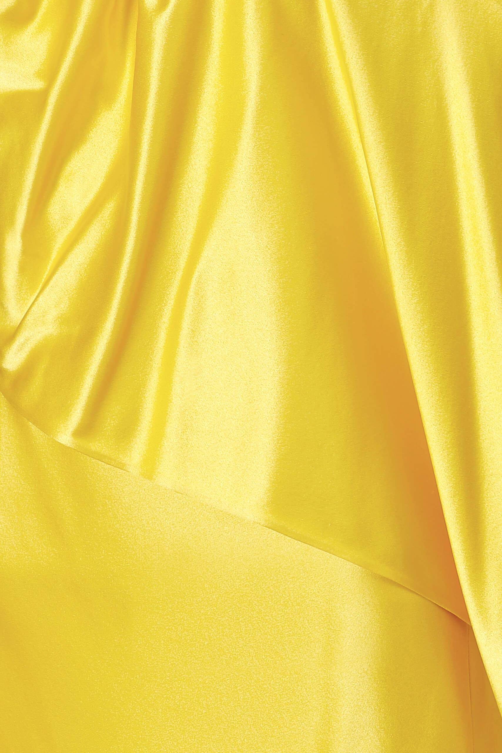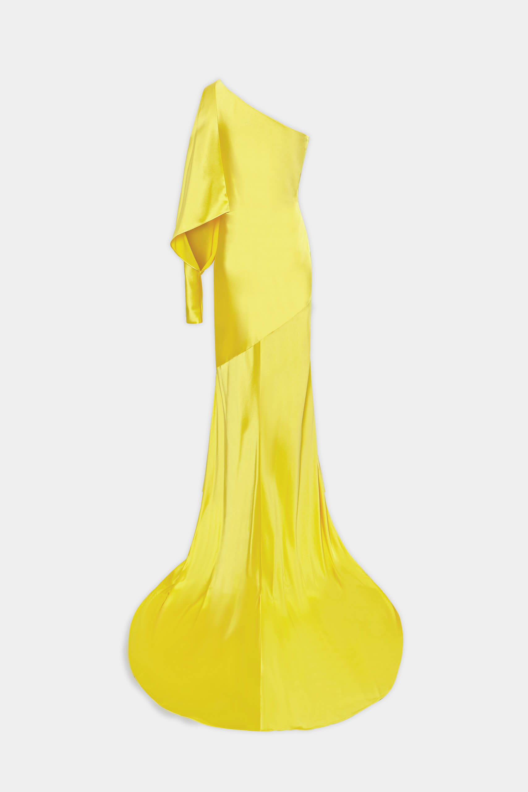 The dress highlights asymmetry in a refined, directional way. Crafted in fluid satin, it features a single long sleeve with a matching shoulder cut-out on the same side, revealing structure through contrast. The design fuses sensuality with architectural clarity.
