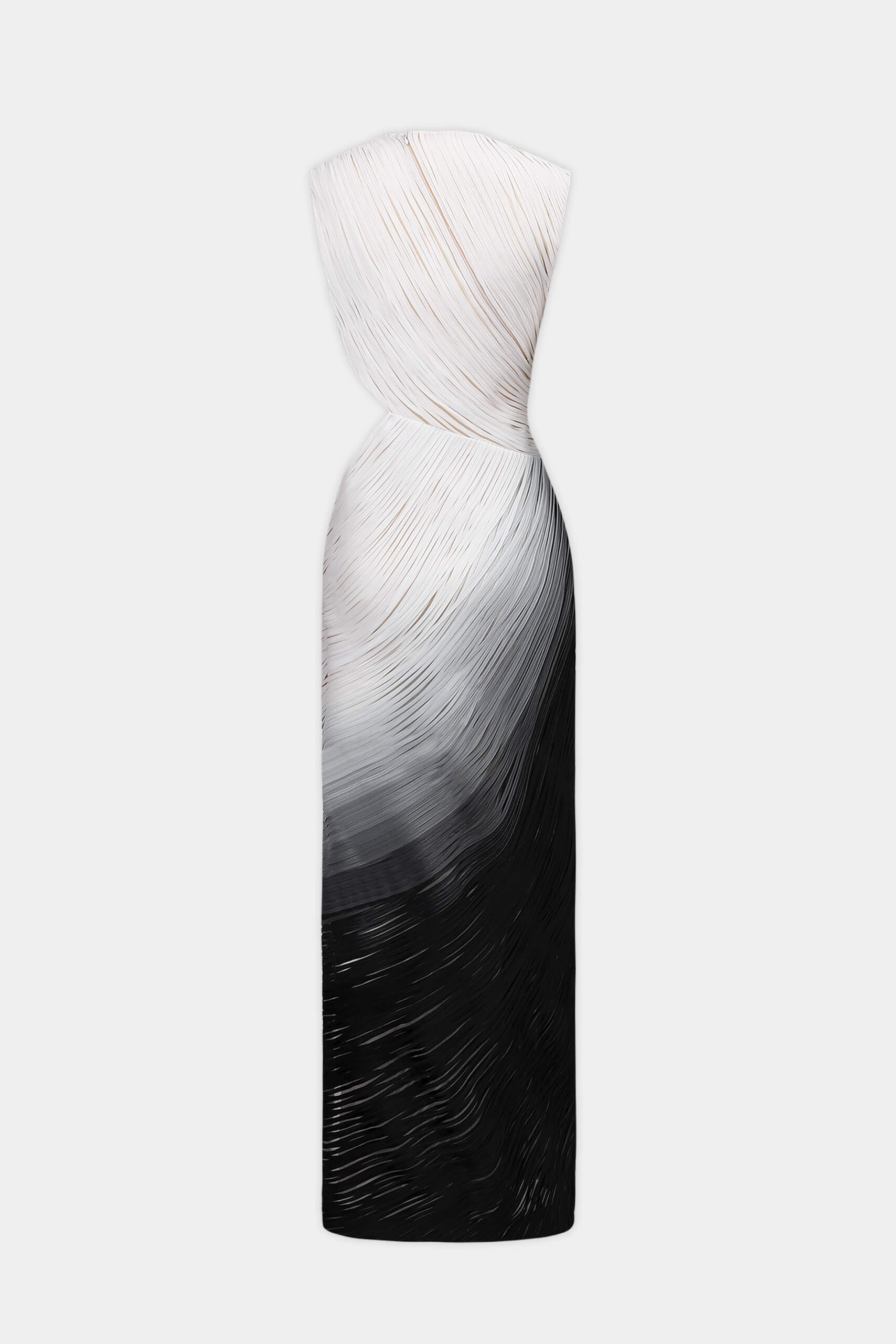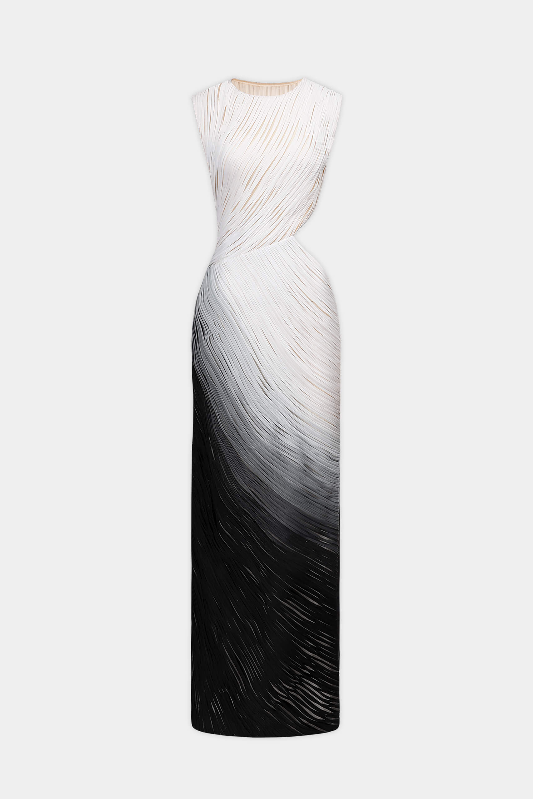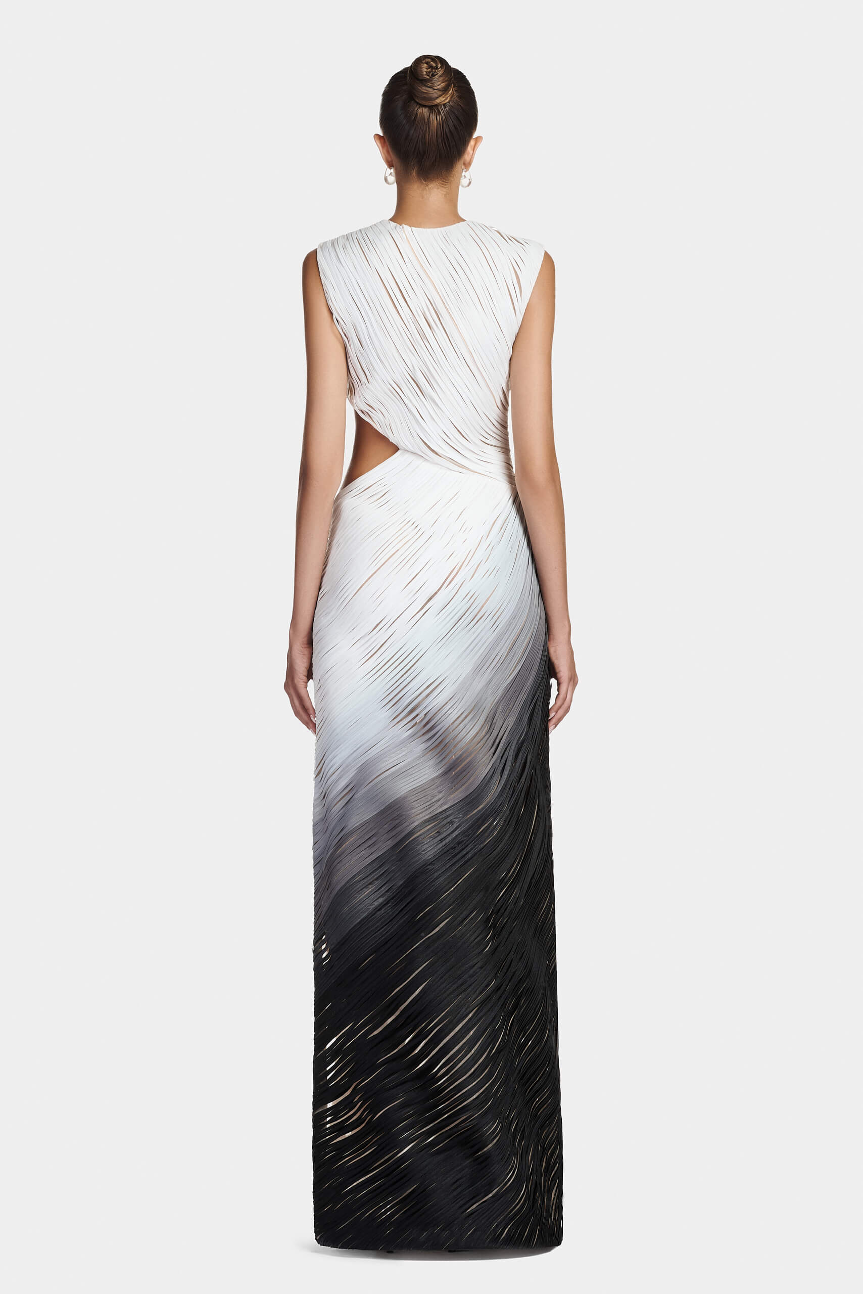 The dress embodies modern sensuality through layered techniques and refined construction. Crafted in sheer mesh with organza striped applique, the silhouette flows with a gradient effect across the fabric. A waist cut-out sharpens the contour, while a subtle slit adds movement and allure.