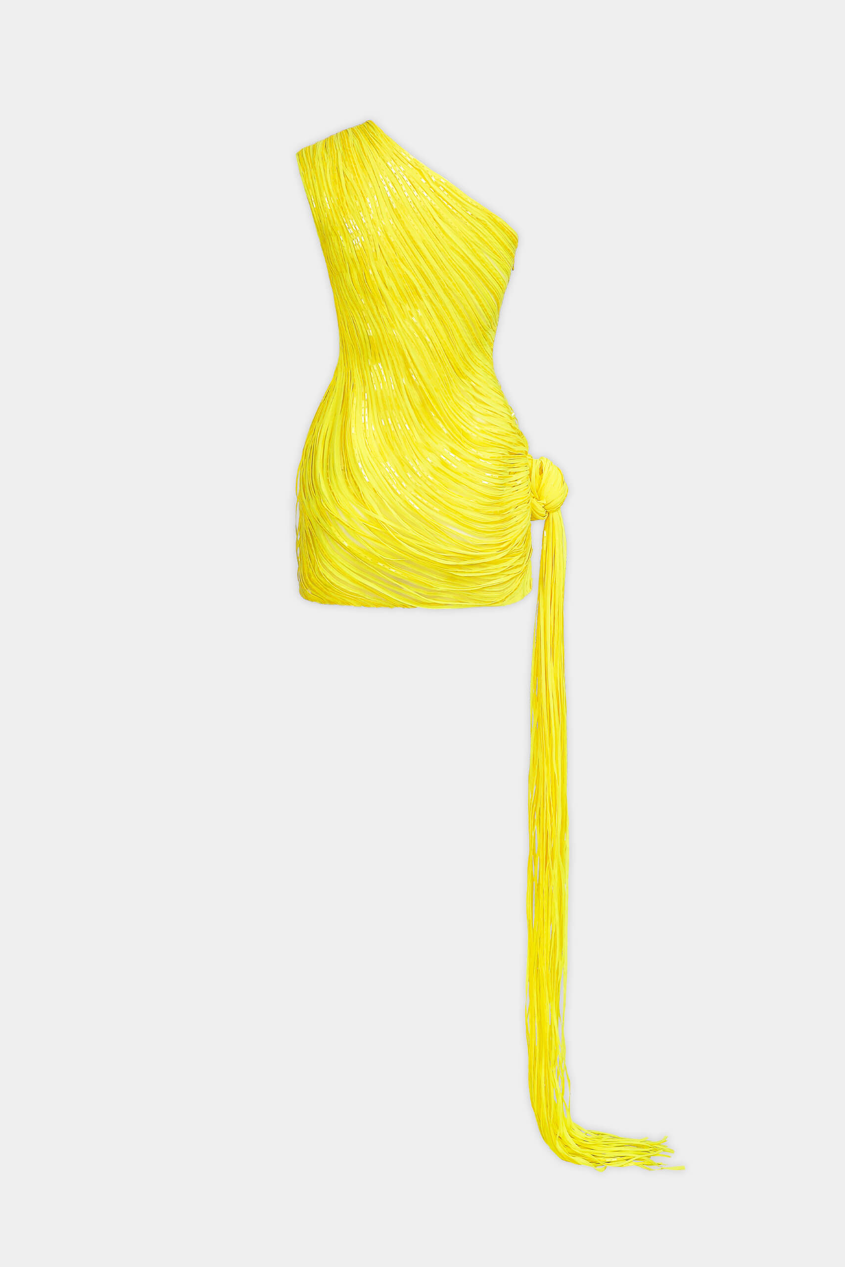 ORGANZA-STRIPED MINI DRESS WITH FRINGE TRAIN