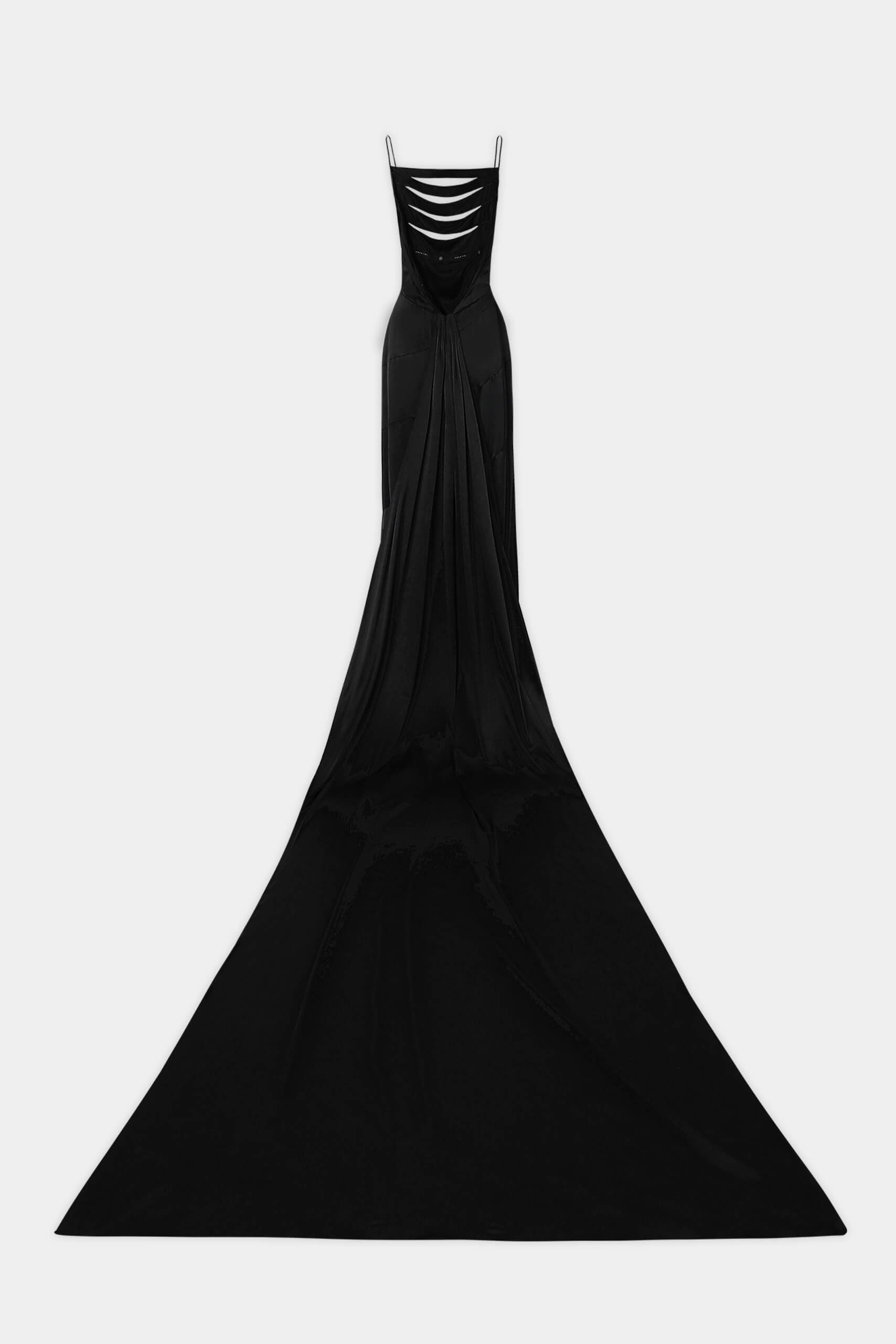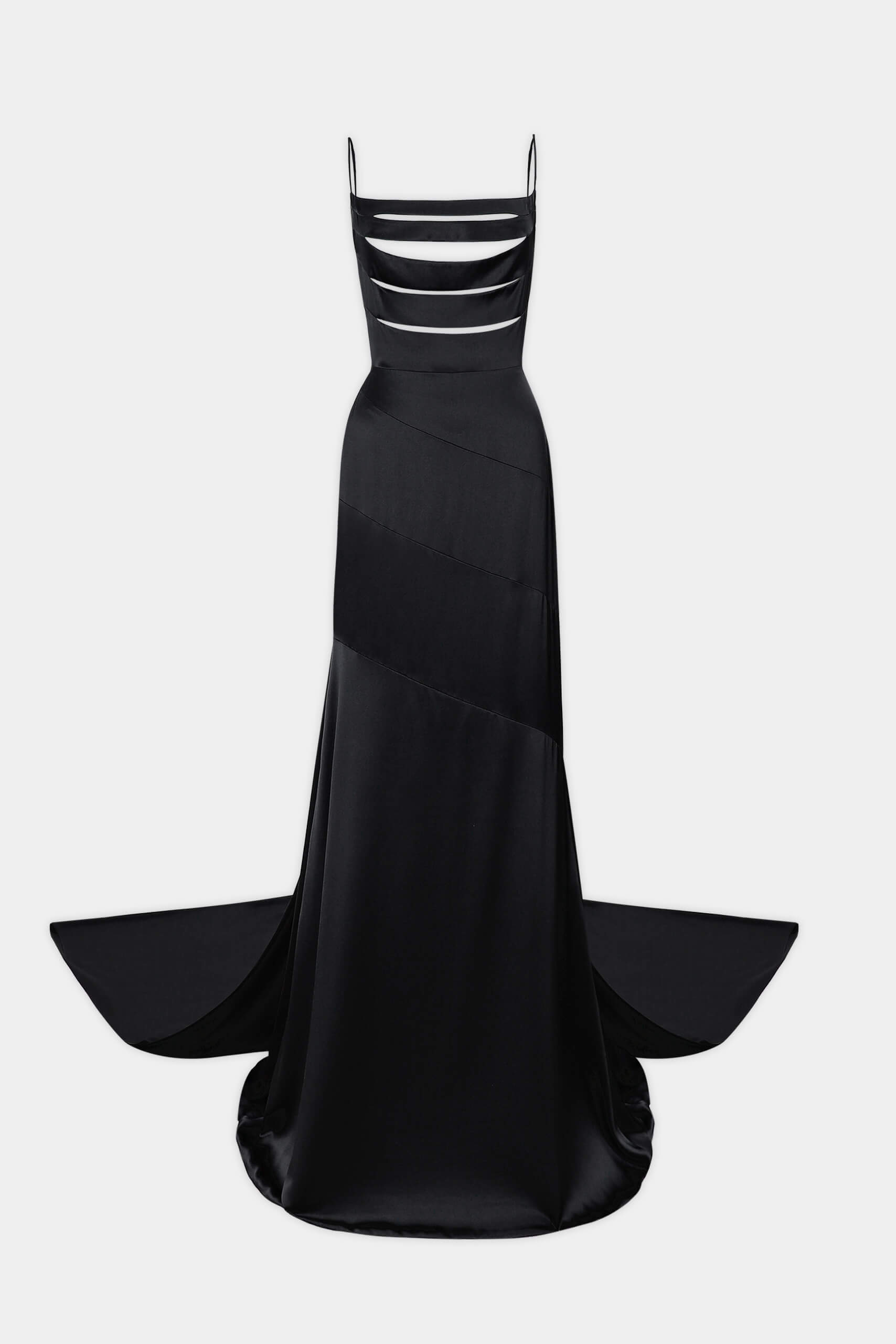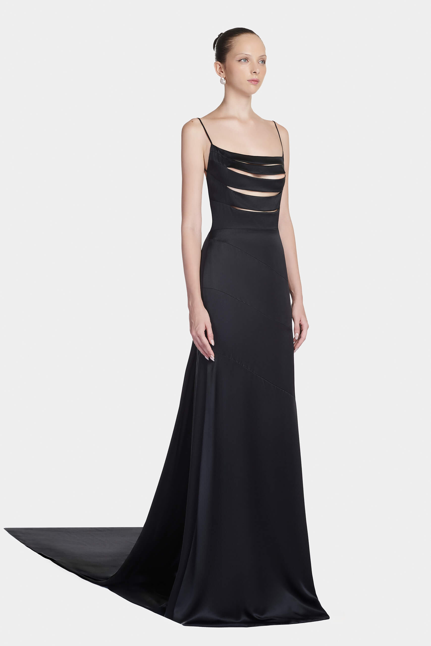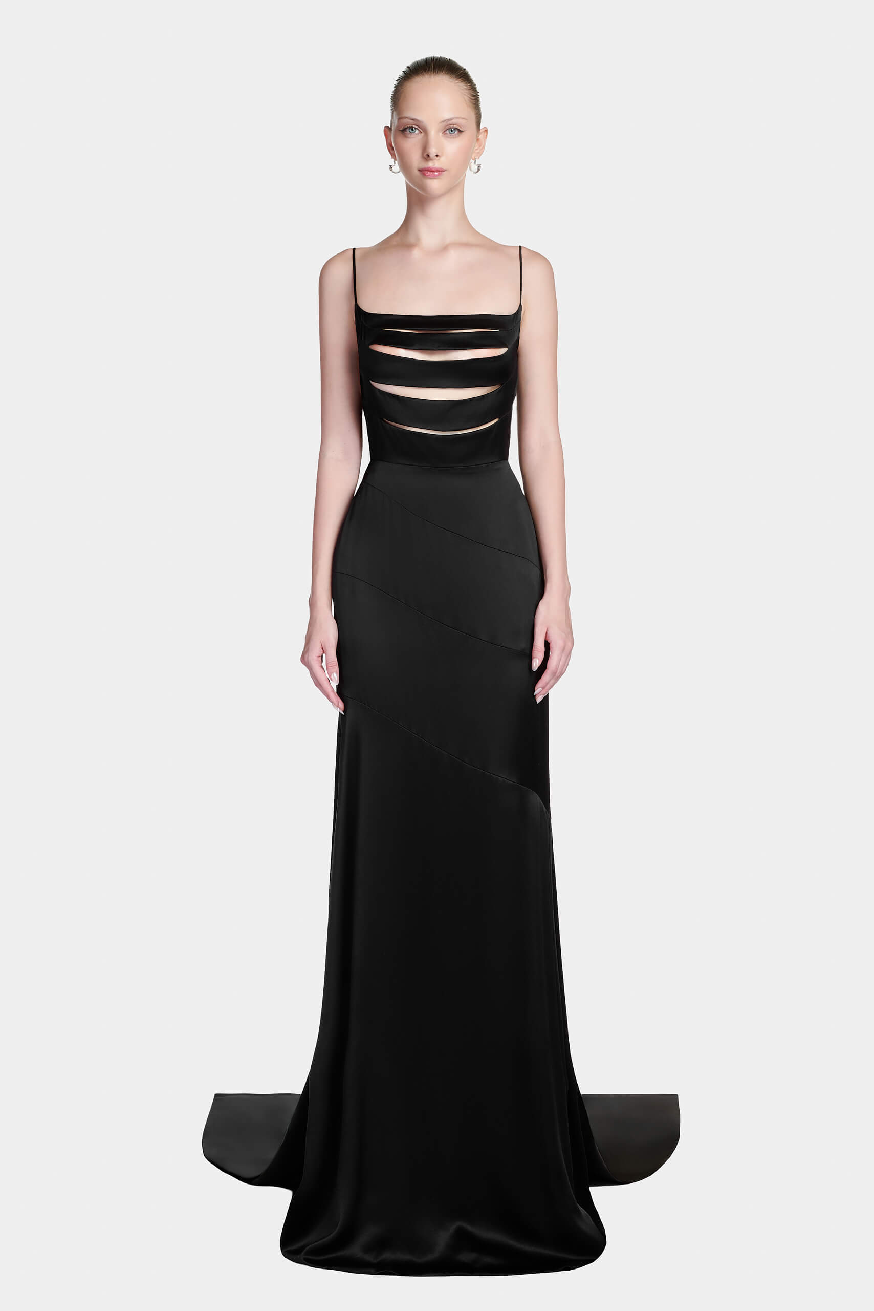 The dress channels modern sensuality with graphic precision. Crafted in lustrous black satin, the silhouette features strategic cut-outs that accentuate the body’s natural lines while preserving elegance. Minimal finishes allow the fabric’s sheen and the bold detailing to stand at the forefront.