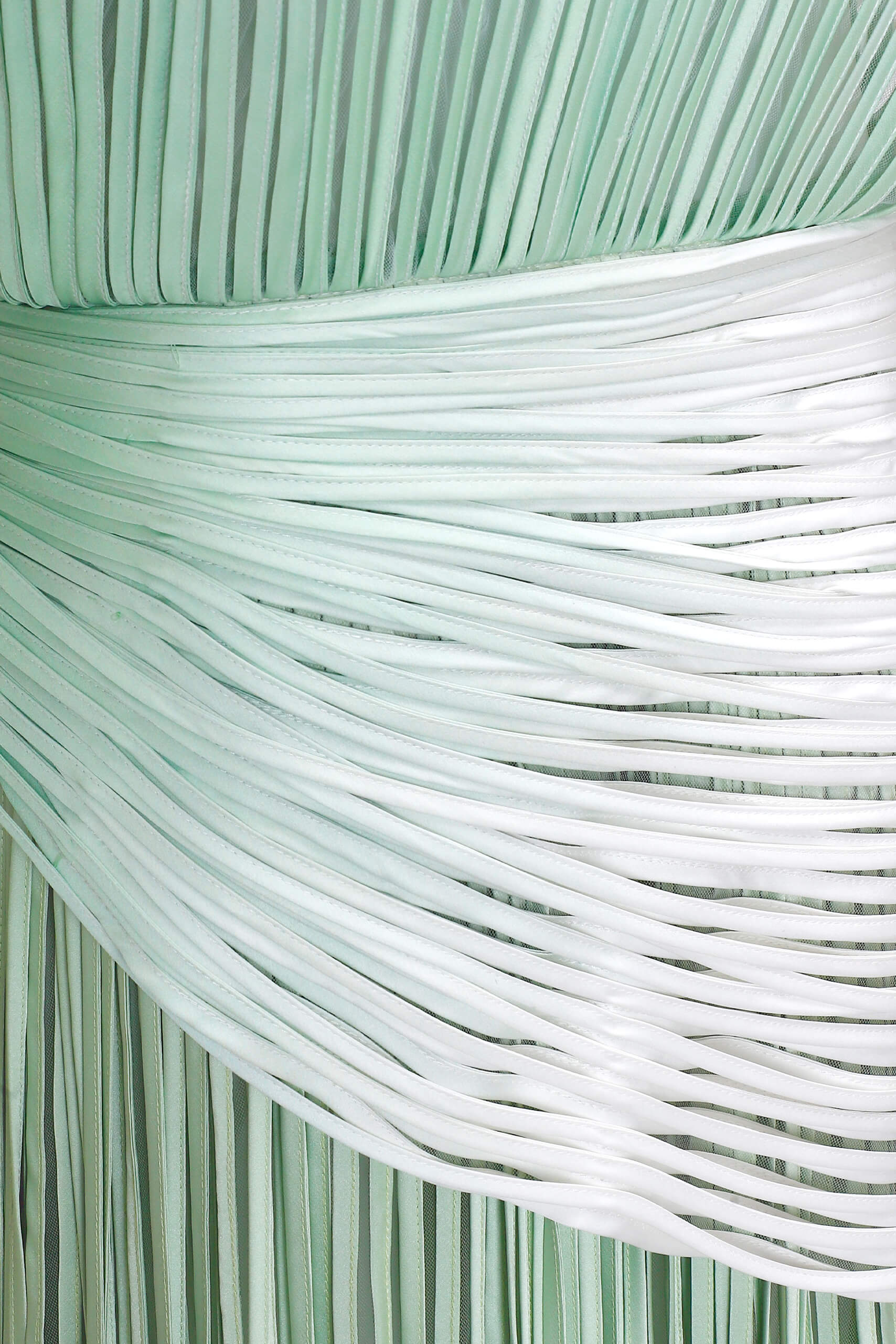 The dress highlights innovative surface treatment balanced with refined construction. Crafted in sheer mesh, the silhouette is interlaced with silk lacing that defines linear structure. Gradient effect flows across the fabric, creating a soft ombré effect that shifts with movement.
