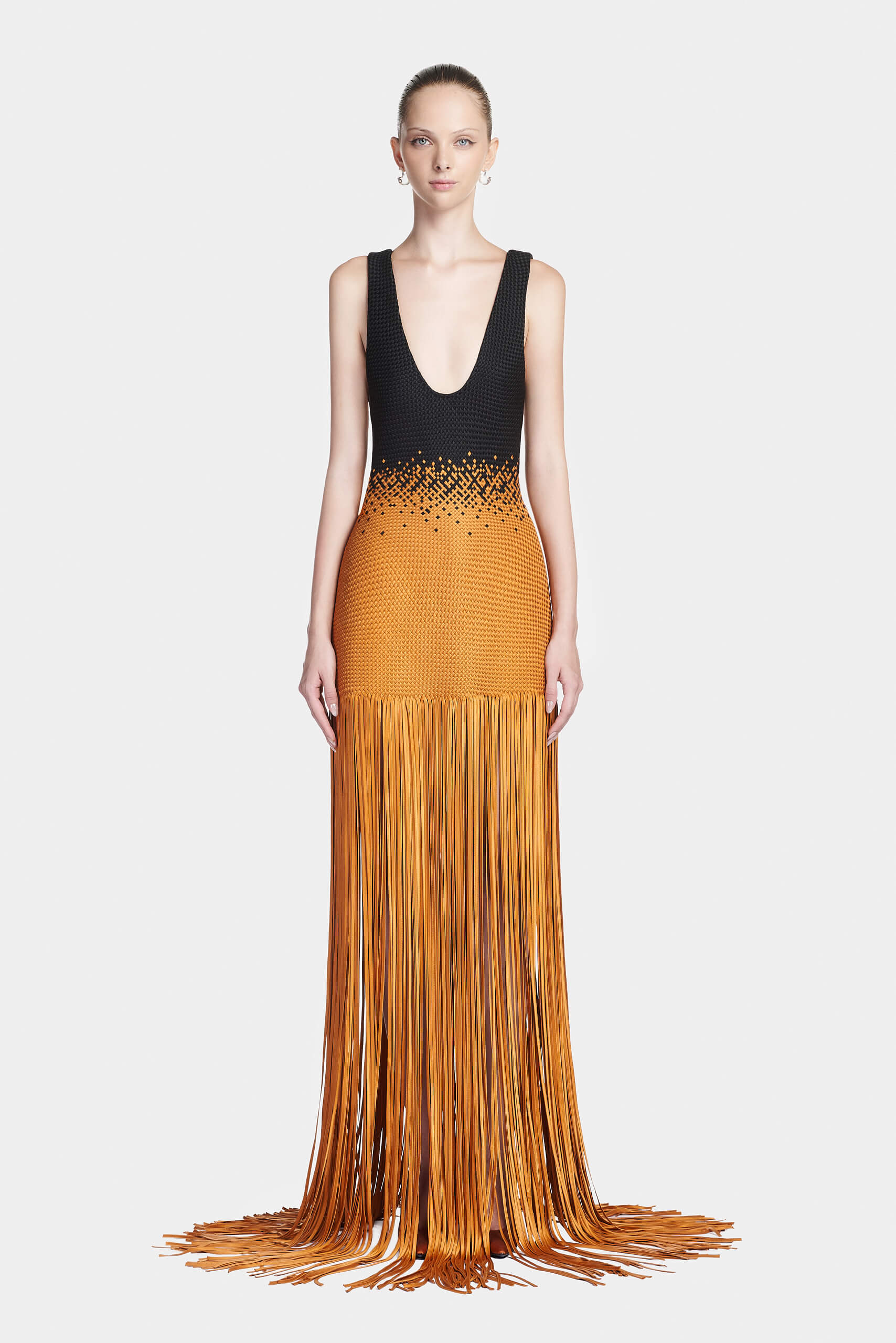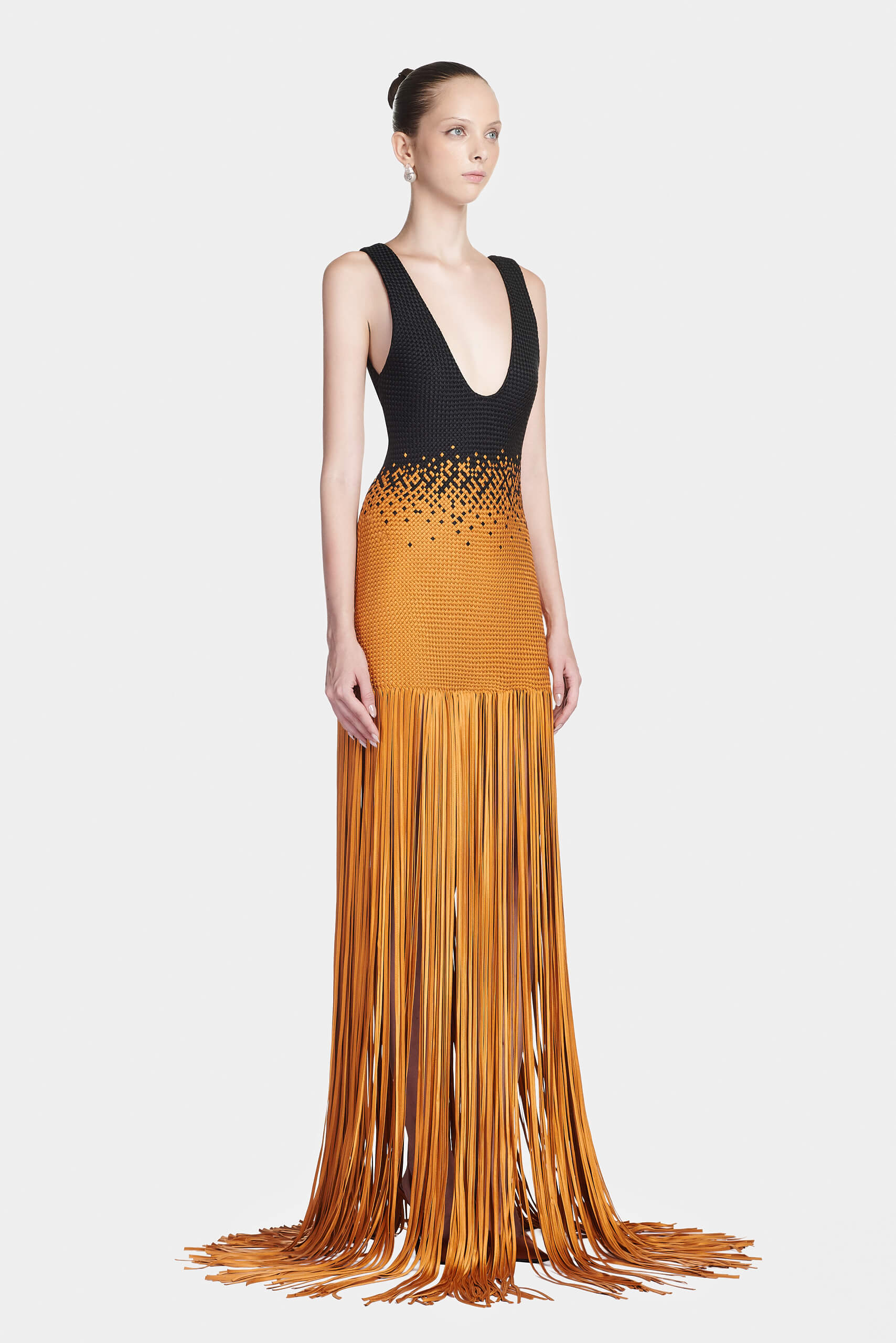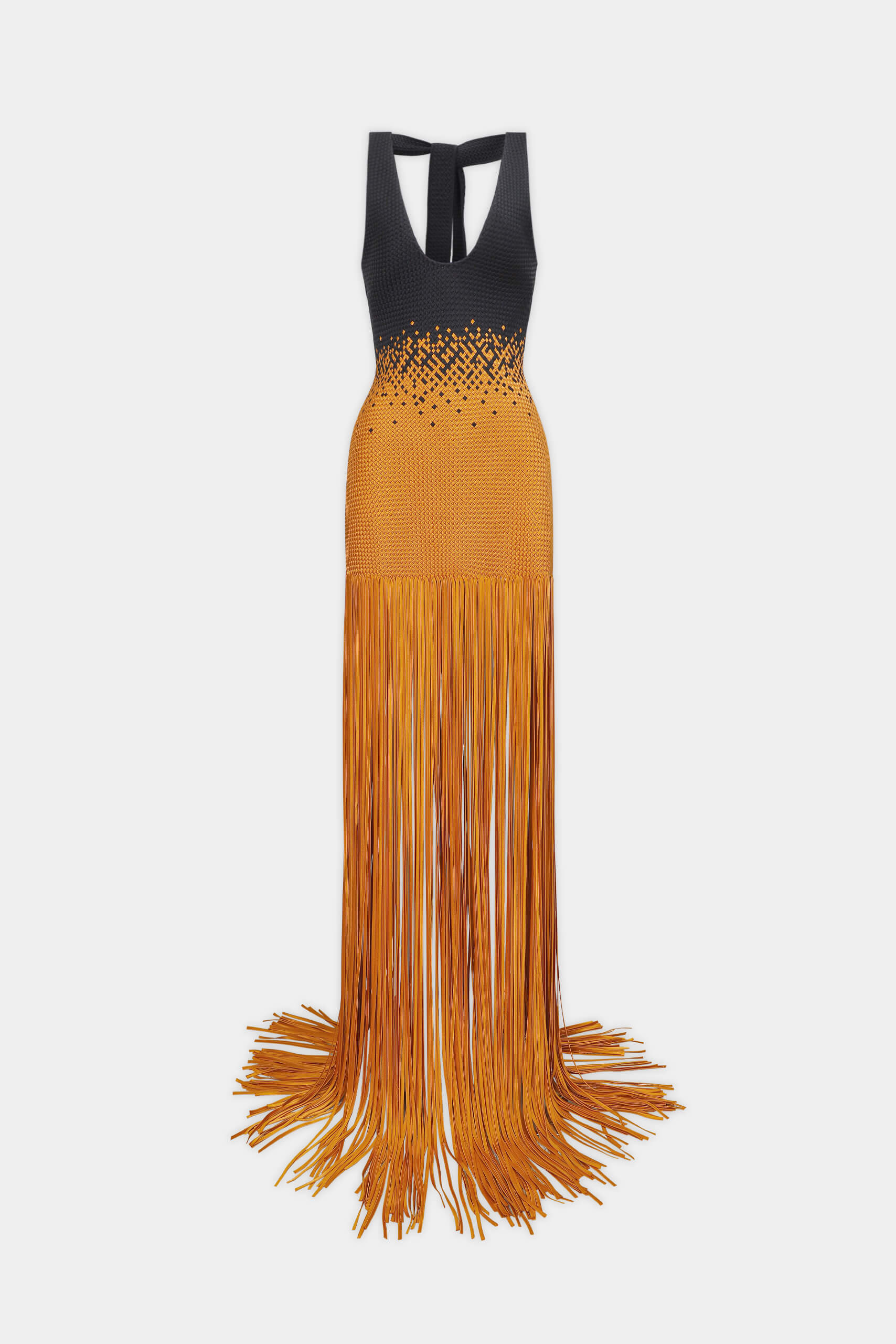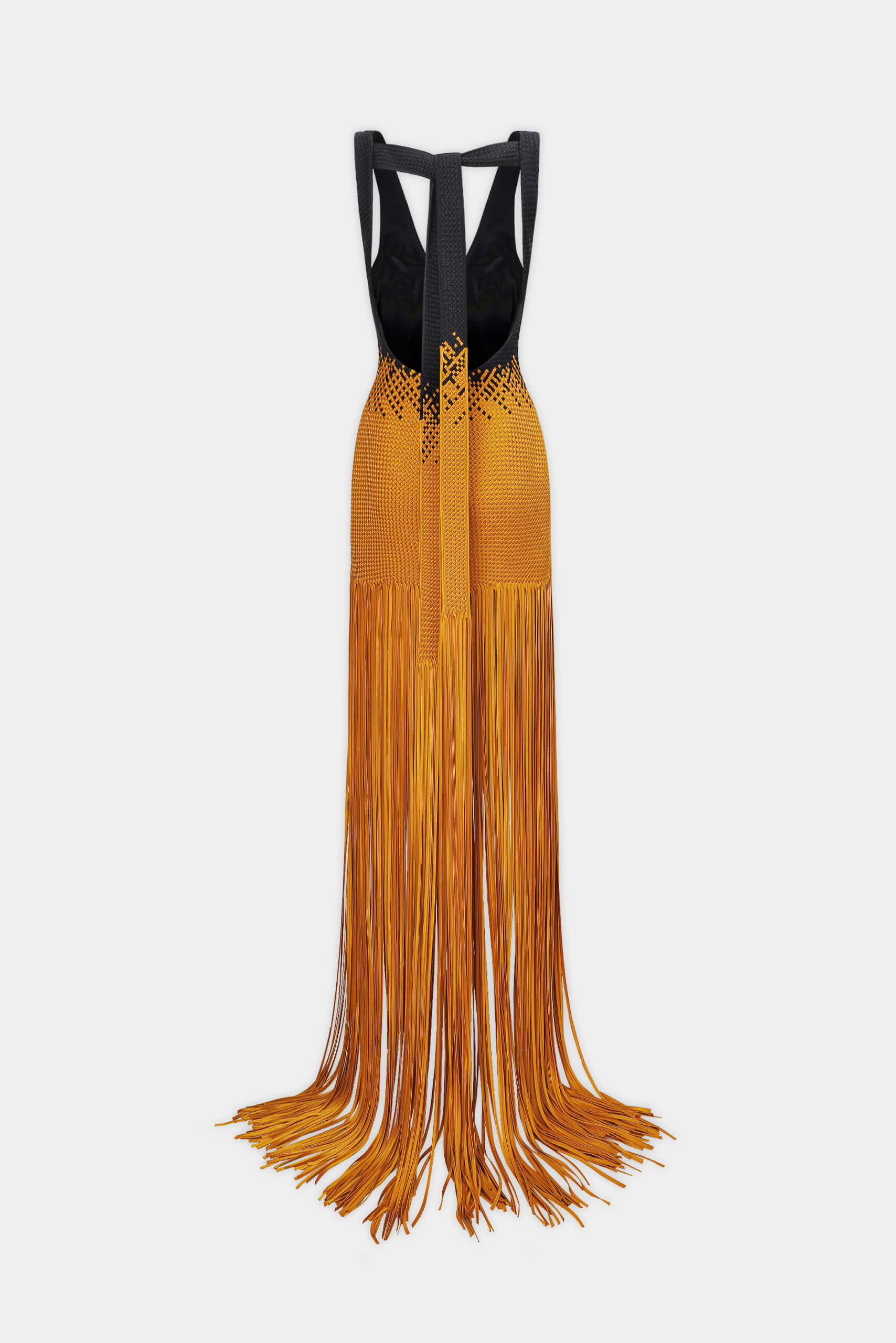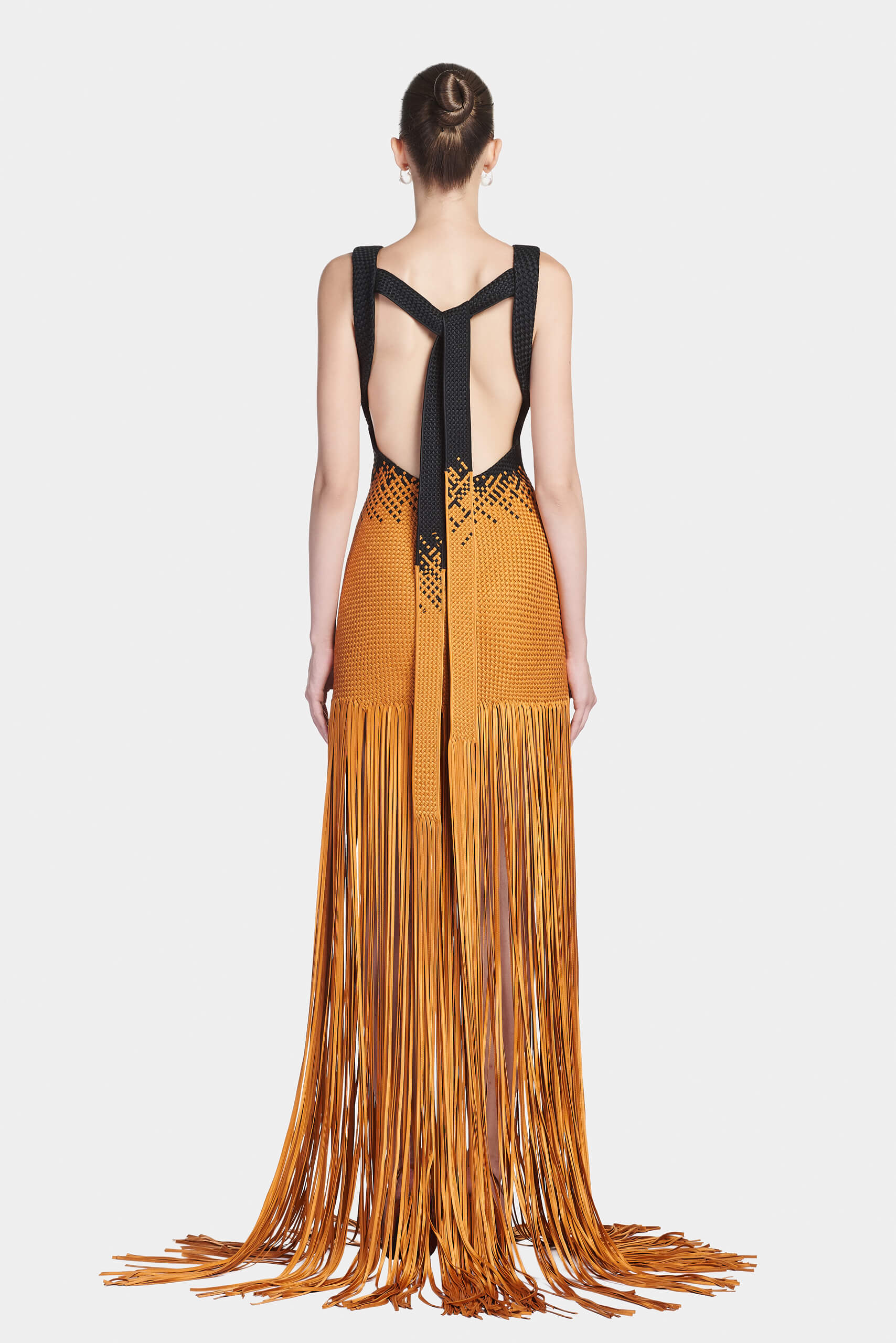 The dress highlights artisanal weaving combined with textural contrast. Crafted in satin, the silhouette is defined by a weave construction, while fringe trimming at the edges adds fluidity and movement. The interplay of sleek satin and tactile detailing creates a dynamic, modern elegance.
